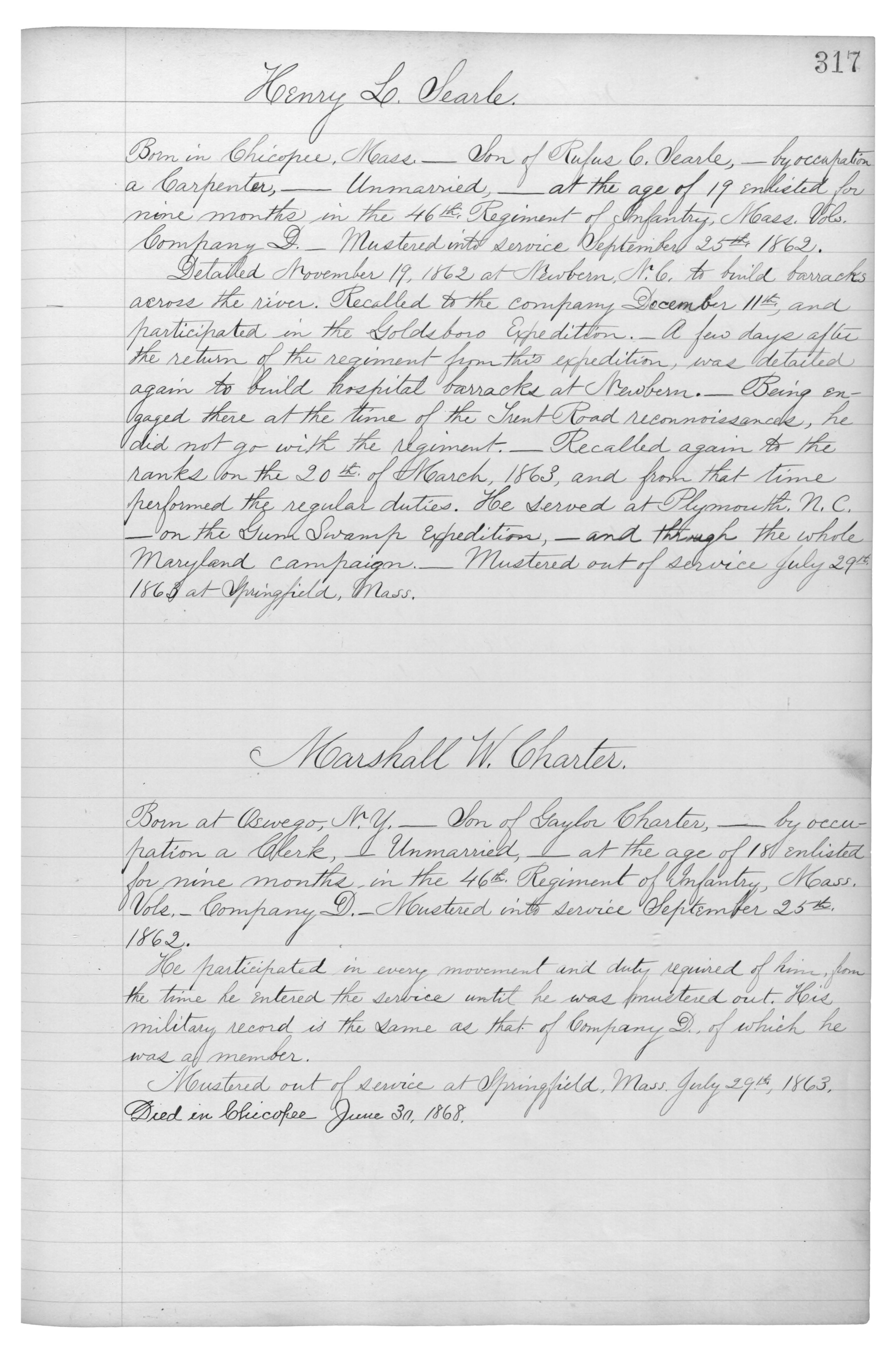 Born in Chicopee, Mass._Son of Rufus C. Searle,_by occupation a Carpenter,_Unmarried,_at the age of 19 enlisted for nine months in the 46th Regiment of Infantry, Mass. Vols, Company D._Mustered into service September 25th 1862.