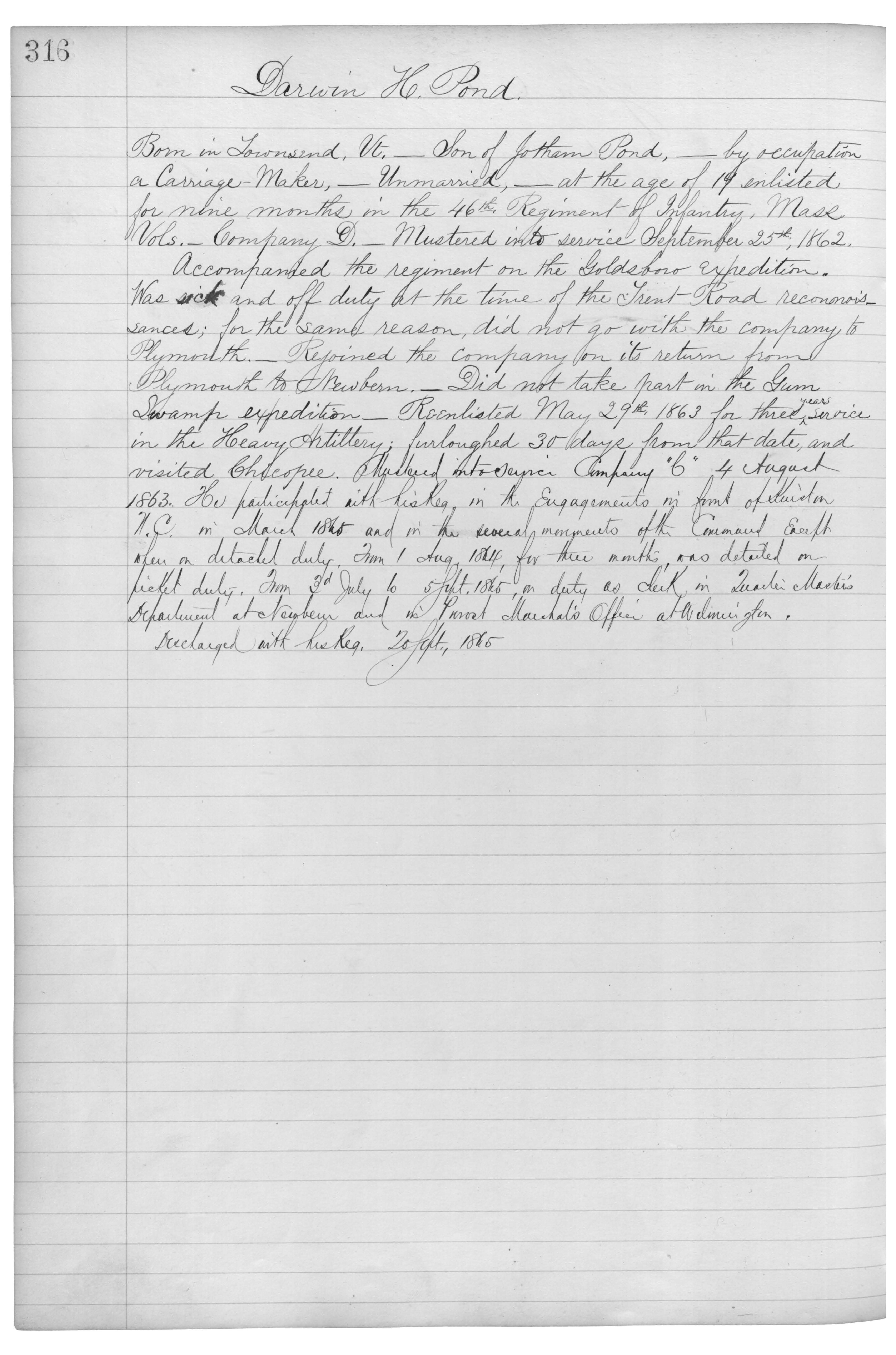 Born in Townsend, Vt,_Son of {Jotham} Pond,_by occupation a Carriage Maker,_Unmarried,_at the age of 19 enlisted for nine months in the 46th Regiment of Infantry, Mass Vols._Company D._Mustered into service September 25th, 1862.