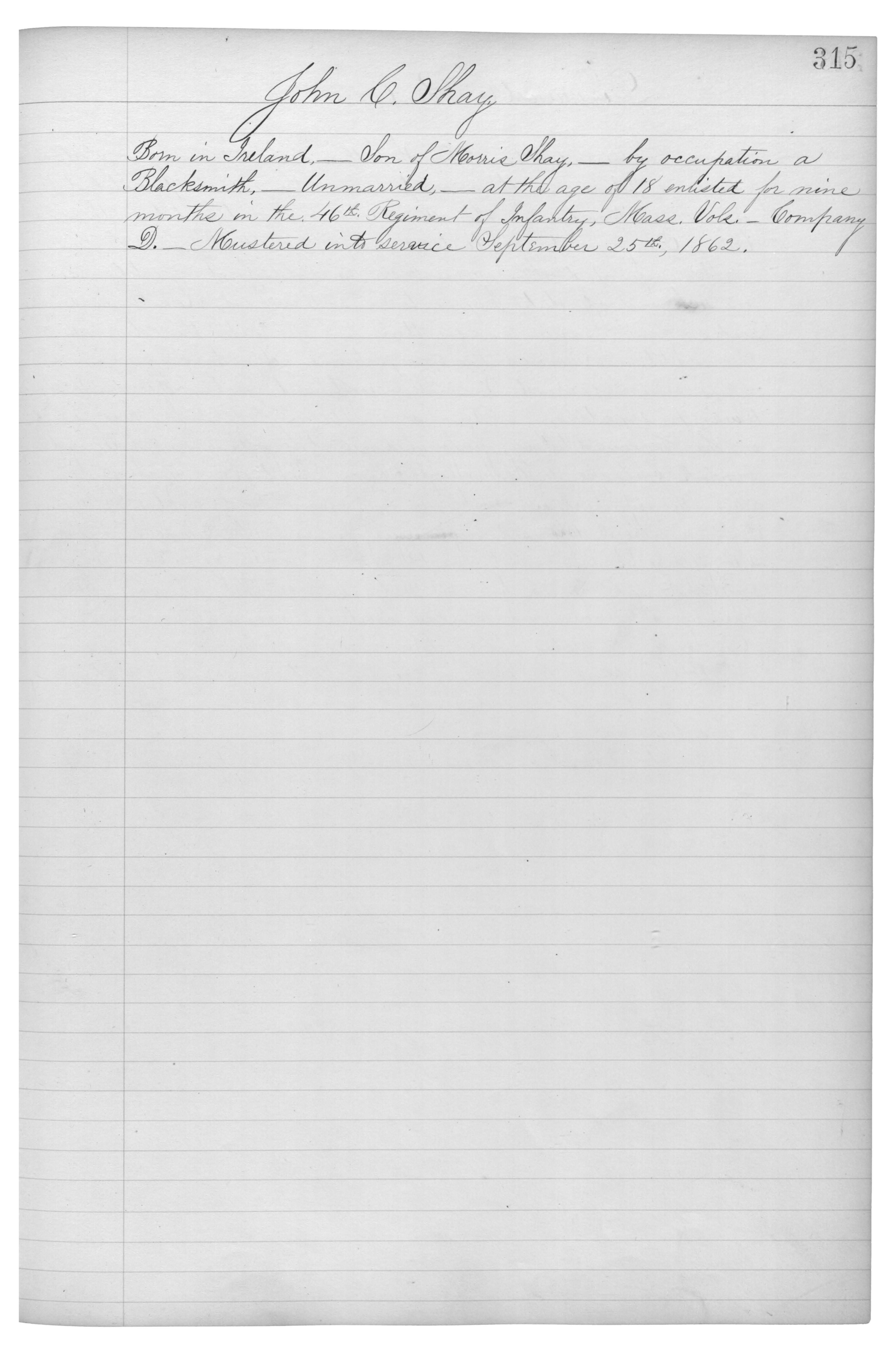 Born in Ireland,_Son of Morris Shay,_by occupation a Blacksmith,_Unmarried,_at the age of 18 enlisted for nine months in the 46th Regiment of Infantry, Mass. Vols._Company D._Mustered into service September 25th, 1862.