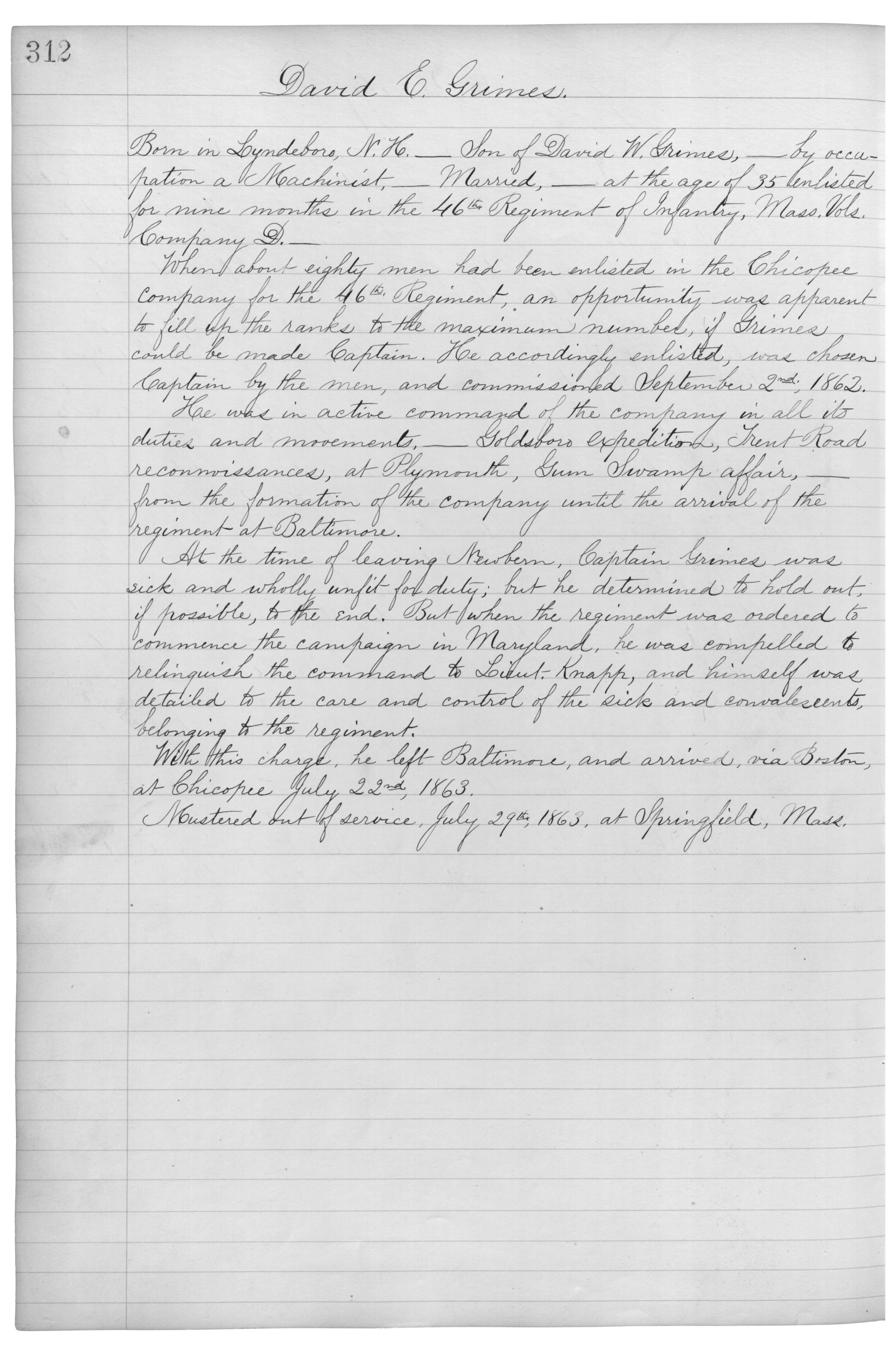 Born in Lyndeboro, N.H._Son of David W. Grimes,_by occupation a Machinist,_Married,_at the age of 35 enlisted for nine months in the 46th Regiment of Infantry, Mass. Vols. Company D._