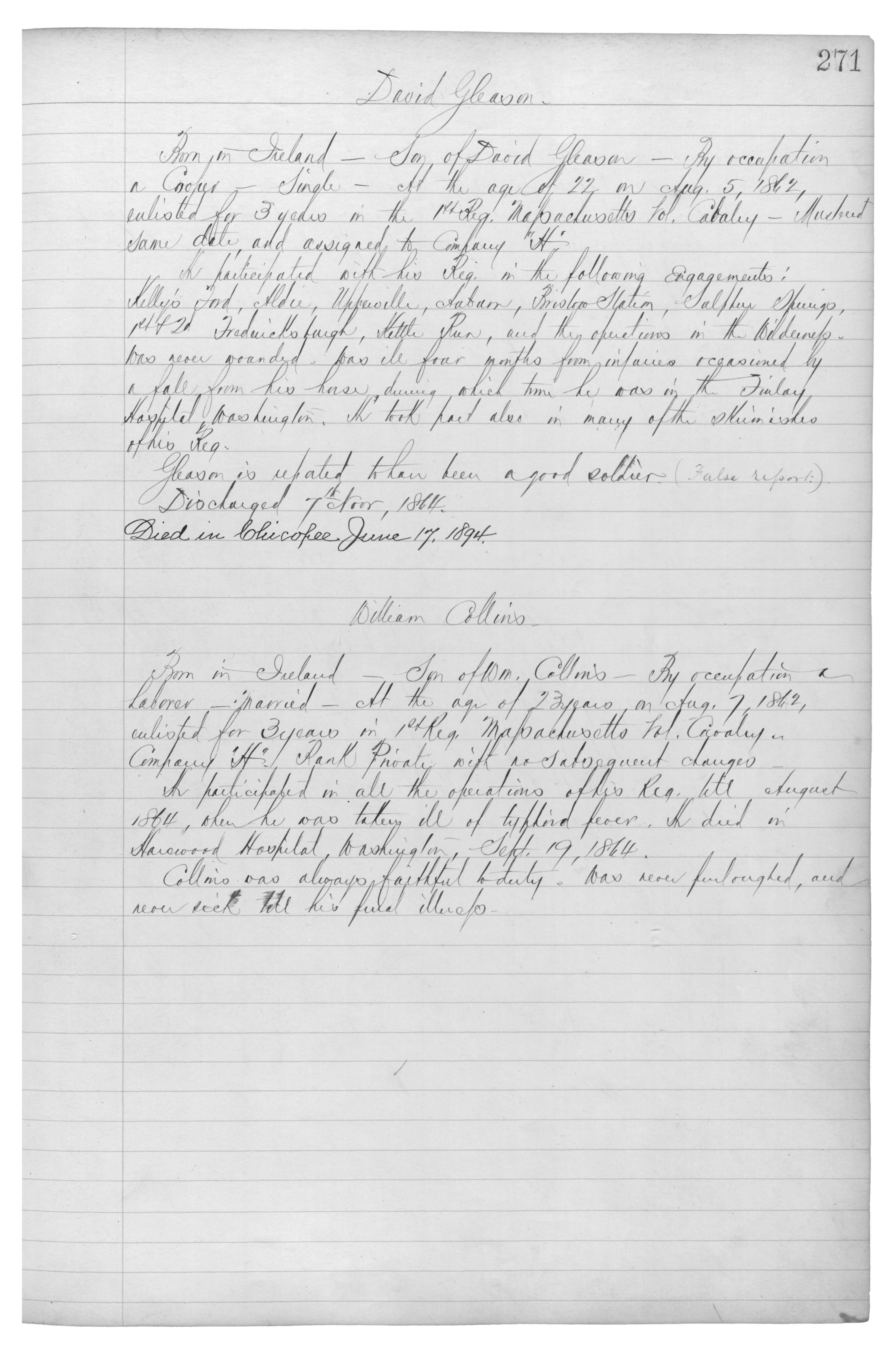 Born in Ireland_Son of David Gleason_by occupation a Cooker_Single_At the age of 22 on Aug. 5, 1862, enlisted for 3 years in the 1st Reg. Massachusetts Vol. Cavalry_Mustered same date, and assigned to Company “H”.