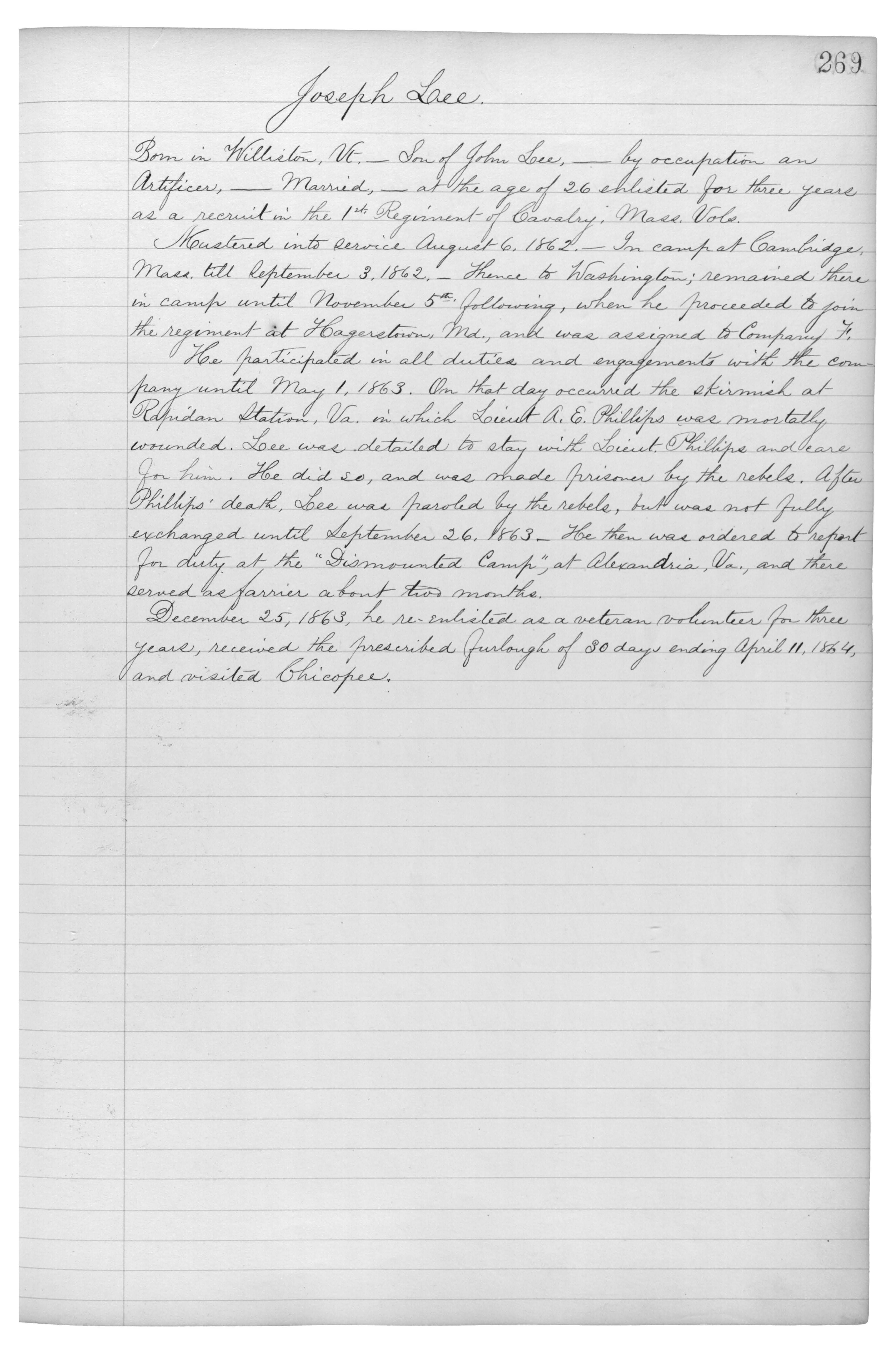 Born in Williston, Vt._Son of John Lee,_by occupation an Artificer,_Married,_at the age of 26 enlisted for three years as a recruit in the 1st Regiment of Cavalry, Mass. Vols.