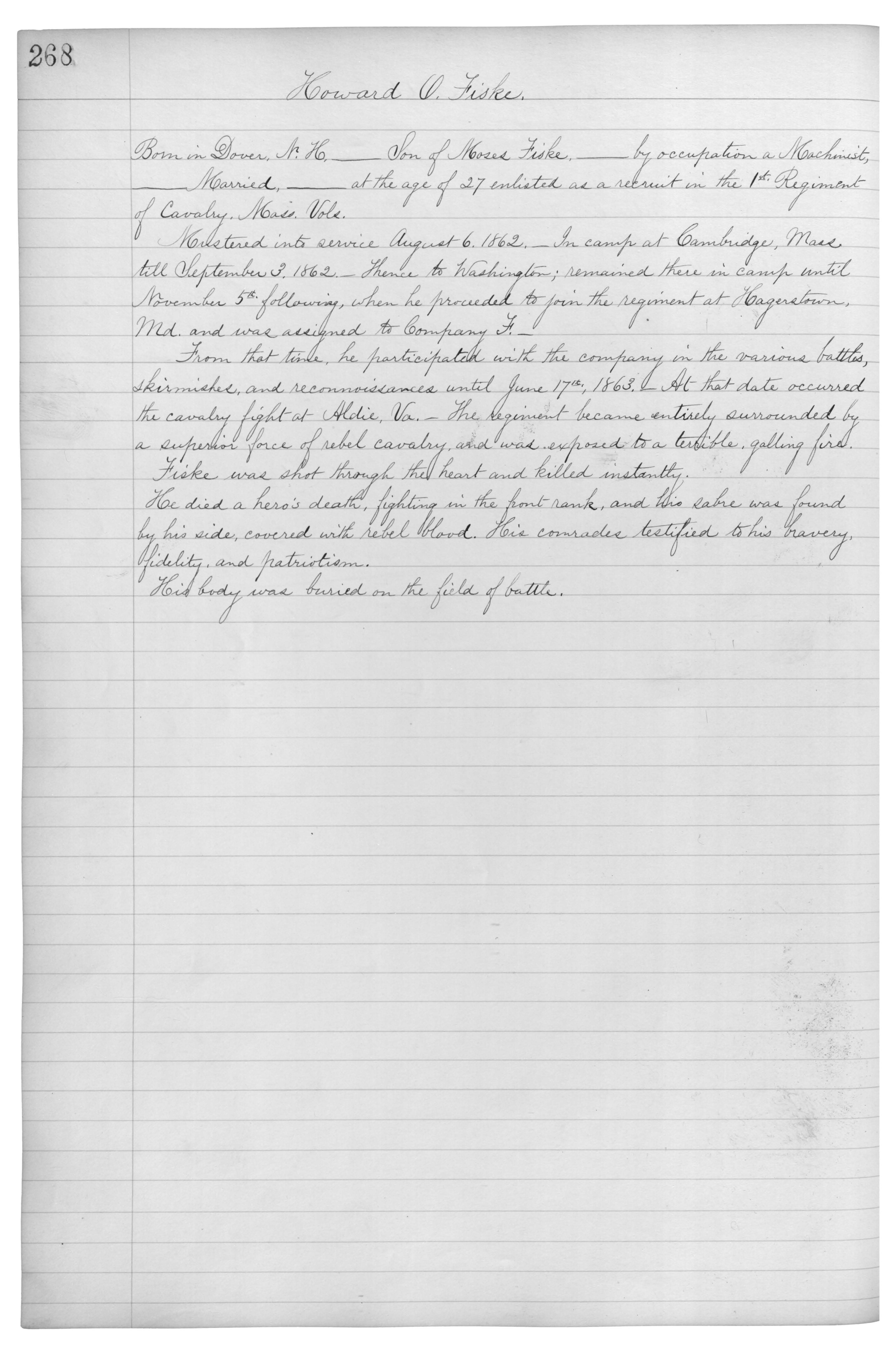 Born in Dover, N.H._Son of Moses fiske,_by occupation a Machinist,_Married,_at the age of 27 enlisted as a recruit in the 1st Regiment of Cavalry, Mass. Vols.