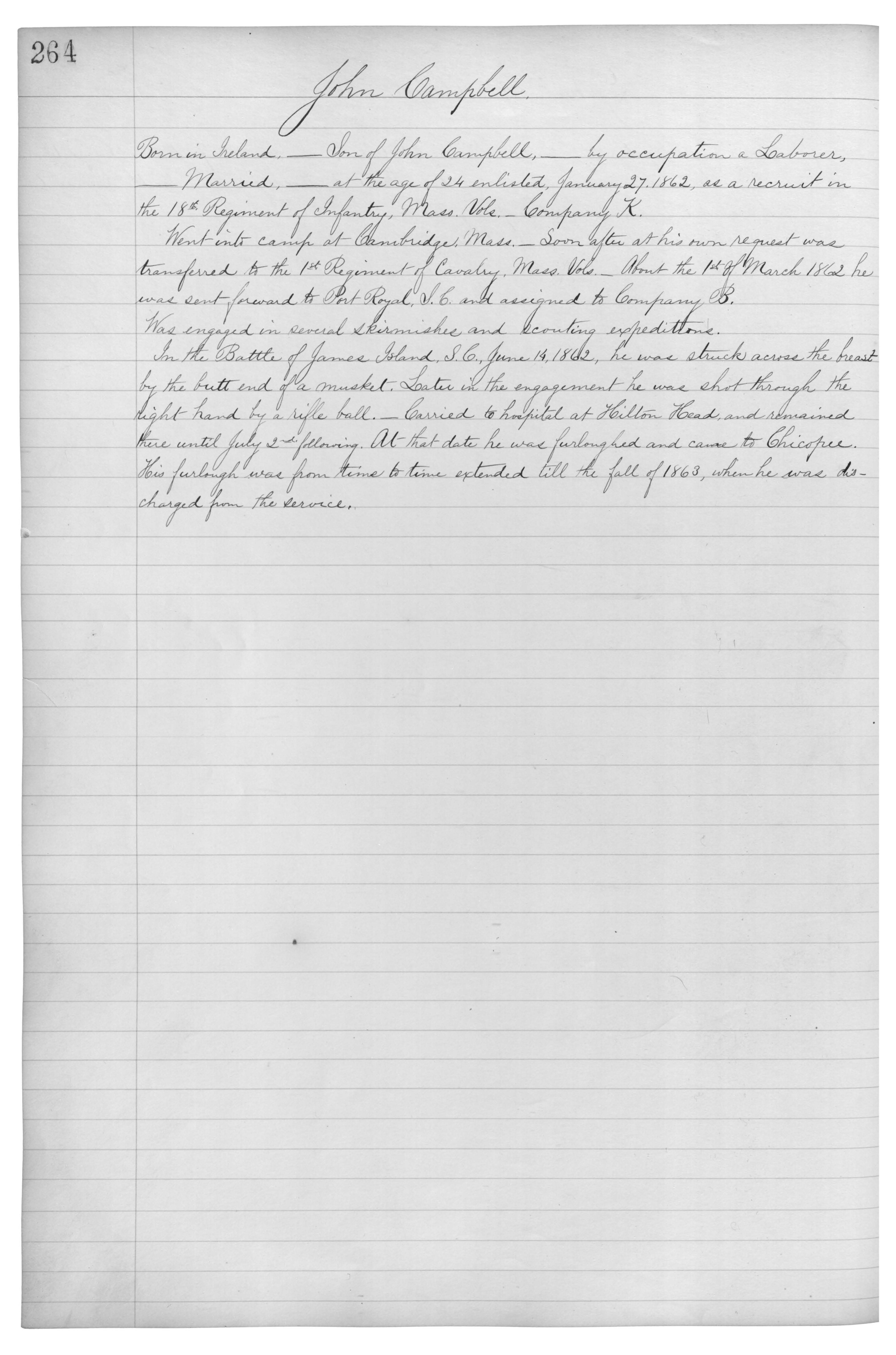 Born in Ireland,_Son of John Campbell,_by occupation a Laborer,_Married,_at the age of 24 enlisted, January 27, 1862, as a recruit in the 18th Regiment of Infantry, Mass. Vols._Company K.