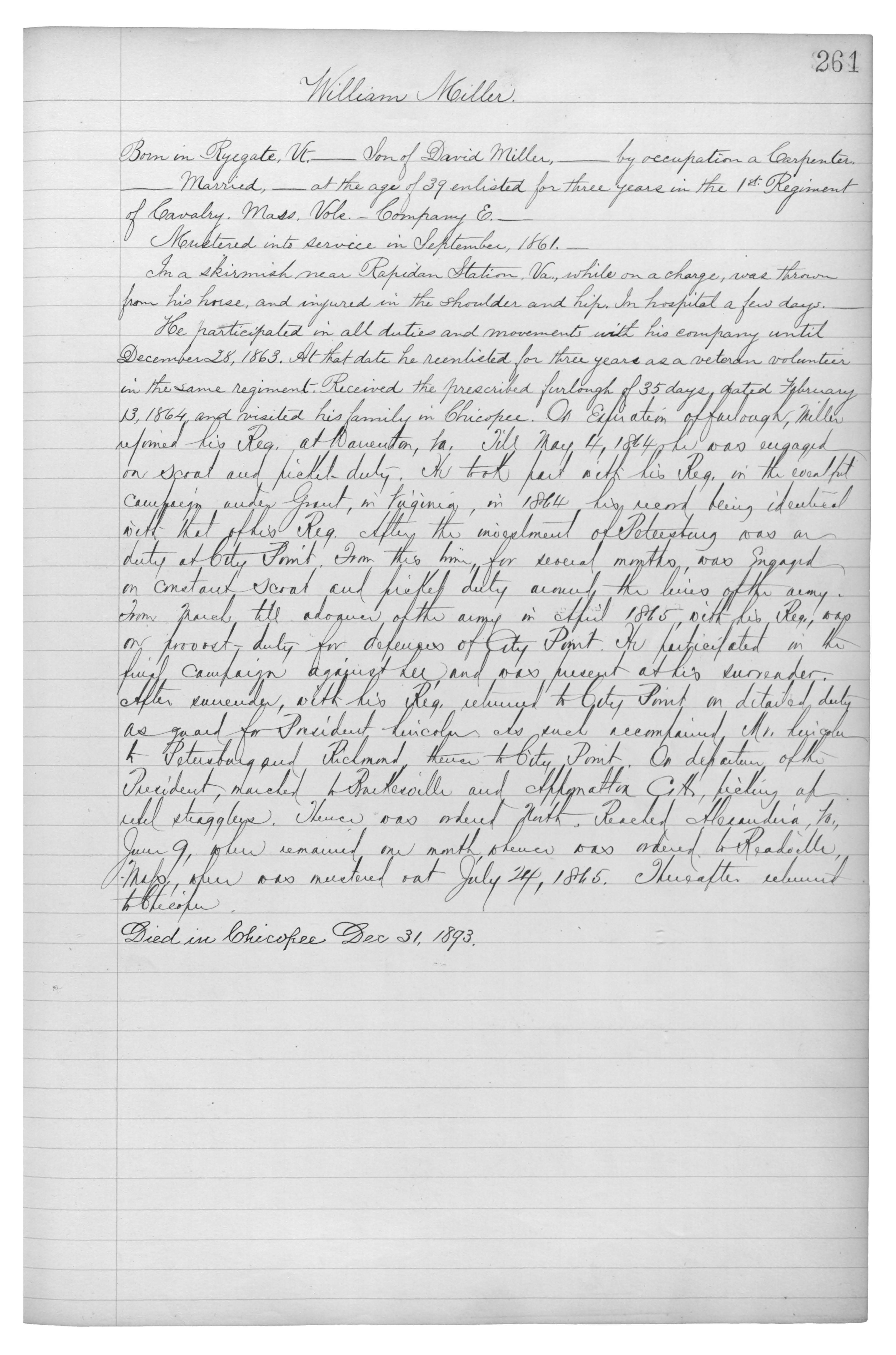 He participated in all duties and movements with his company until December 28, 1863. At that date he reenlisted for three years as a veteran volunteer in the same regiment. Received the prescribed furlough of 35 days dated February 13, 1864, and visited his family in Chicopee. ON expiration of furlough, Miller rejoined his Reg. at {Warrenton}, Va. Till May 4, 1864, he was engaged on scout and picket duty. He took part with his Reg. in the eventful campaign under Grant, in Virginia, in 1864 his record being identical with that of his Reg. After the investment of Petersburg was on duty at City Point. From this time for several months was engaged on constant scout and picket duty around the lines of the army. From March till advance of the army in April 1865, with his Reg., was on provost duty for defenses of City Point. He participated in the final campaign against Lee and was present at his surrender. After surrender, with his Reg. relieved to City Point on detailed duty as guard for President Lincoln. As such accompanied Mr. Lincoln to Petersurg and Richmond thence to City Point. On departure of the president, marched to {Backesville} and Appomattox Ct., picking up rebel stragglers. Thence was ordered North. Reached Alexandria, Va., {June} 9, where remained one month, whence was ordered to Readville, Mass. where was mustered out July 24, 1865. Thereafter returned to Chicopee.