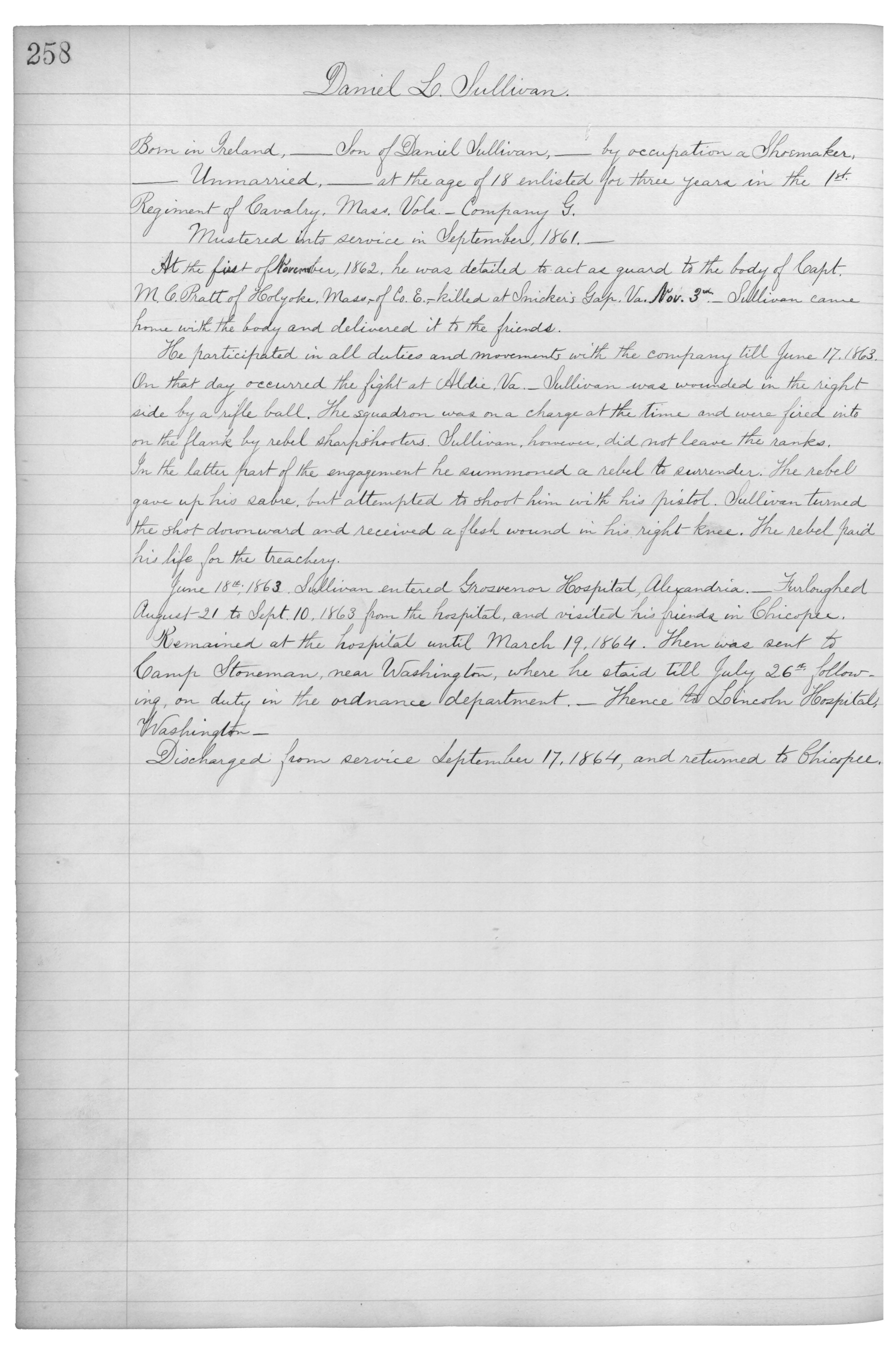 At the first of November, 1862, he was detailed to act as guard to the body of Capt. M.C. Pratt of Holyoke. Mass. of Co. E.,_killed at Snicker’s Gap, Va. Nov. 3rd._Sulivan came home with the body and delivered it to the fiends.