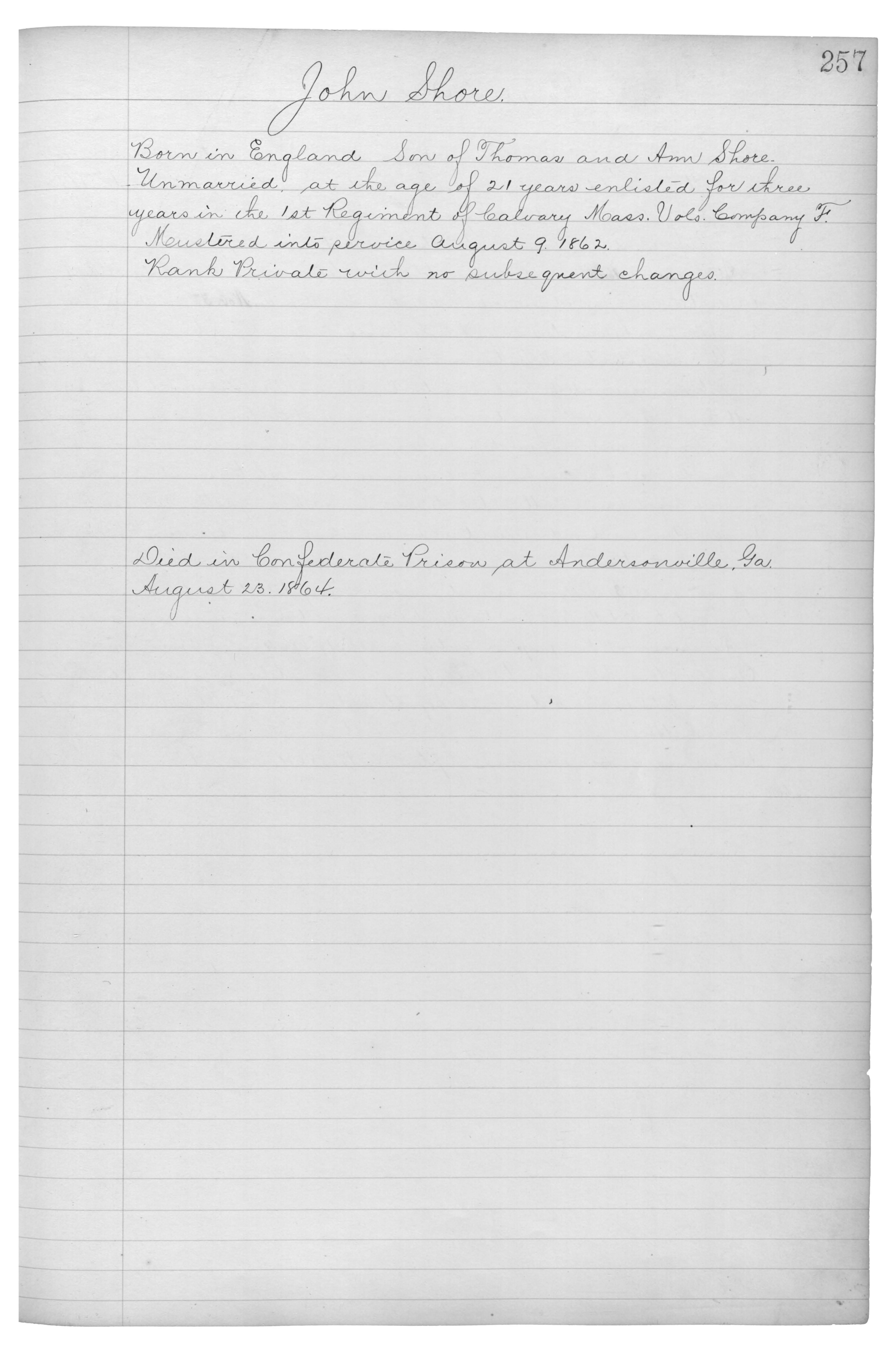 Born in England_Son of Thomas and Ann Shore_Unmarried_At the ge of 21 years enlisted for three years in the 1st Regiment of Calvary Mass. Vols. Company F.