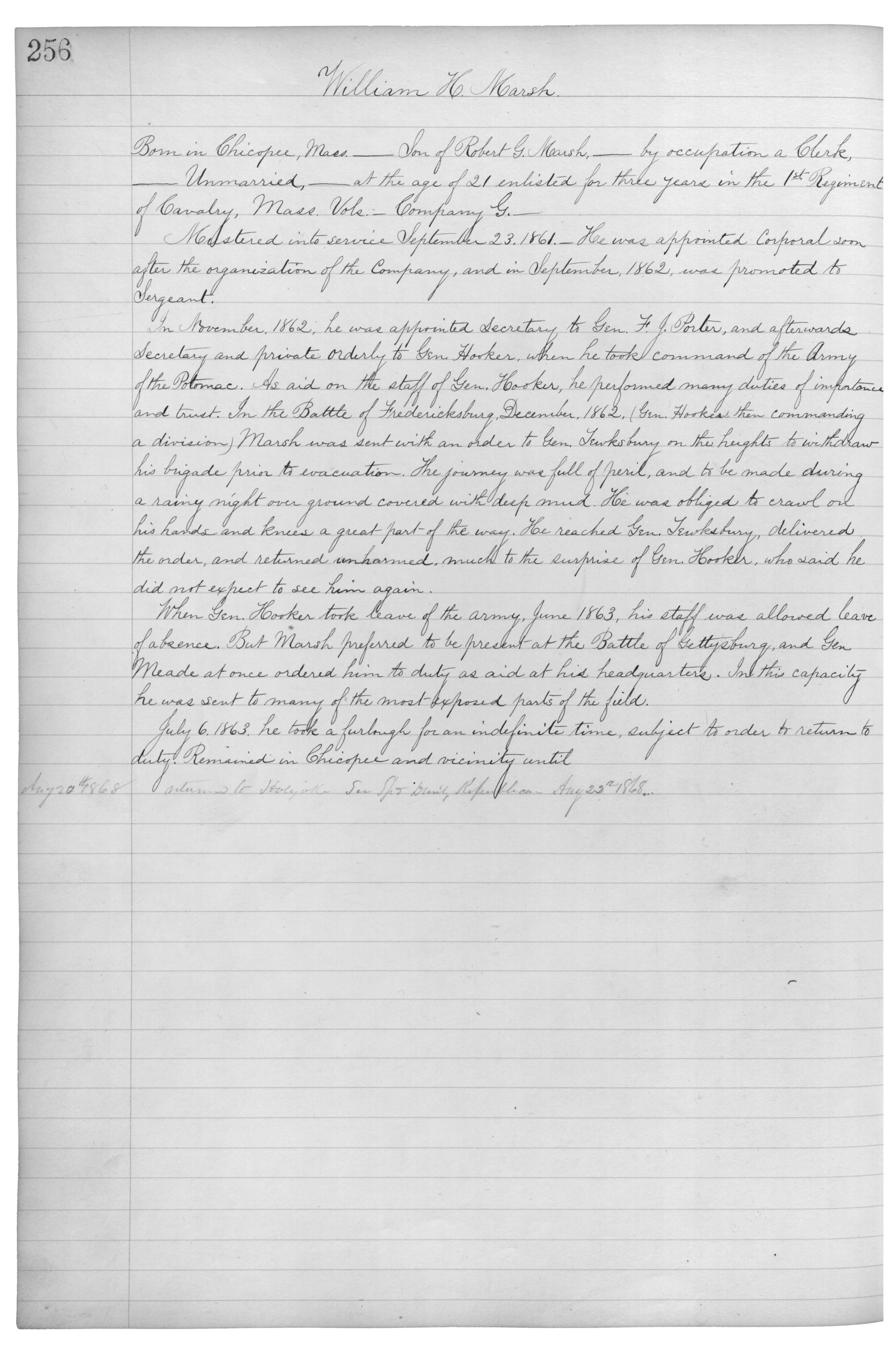 Born in Chicopee, Ma._Son of Robert G. Marsh,_by occupation a Clerk,_Unmarried,_at the age of 21 enlisted for three years in the 1st Regiment of Cavalry, Mass. Vols._Company G._