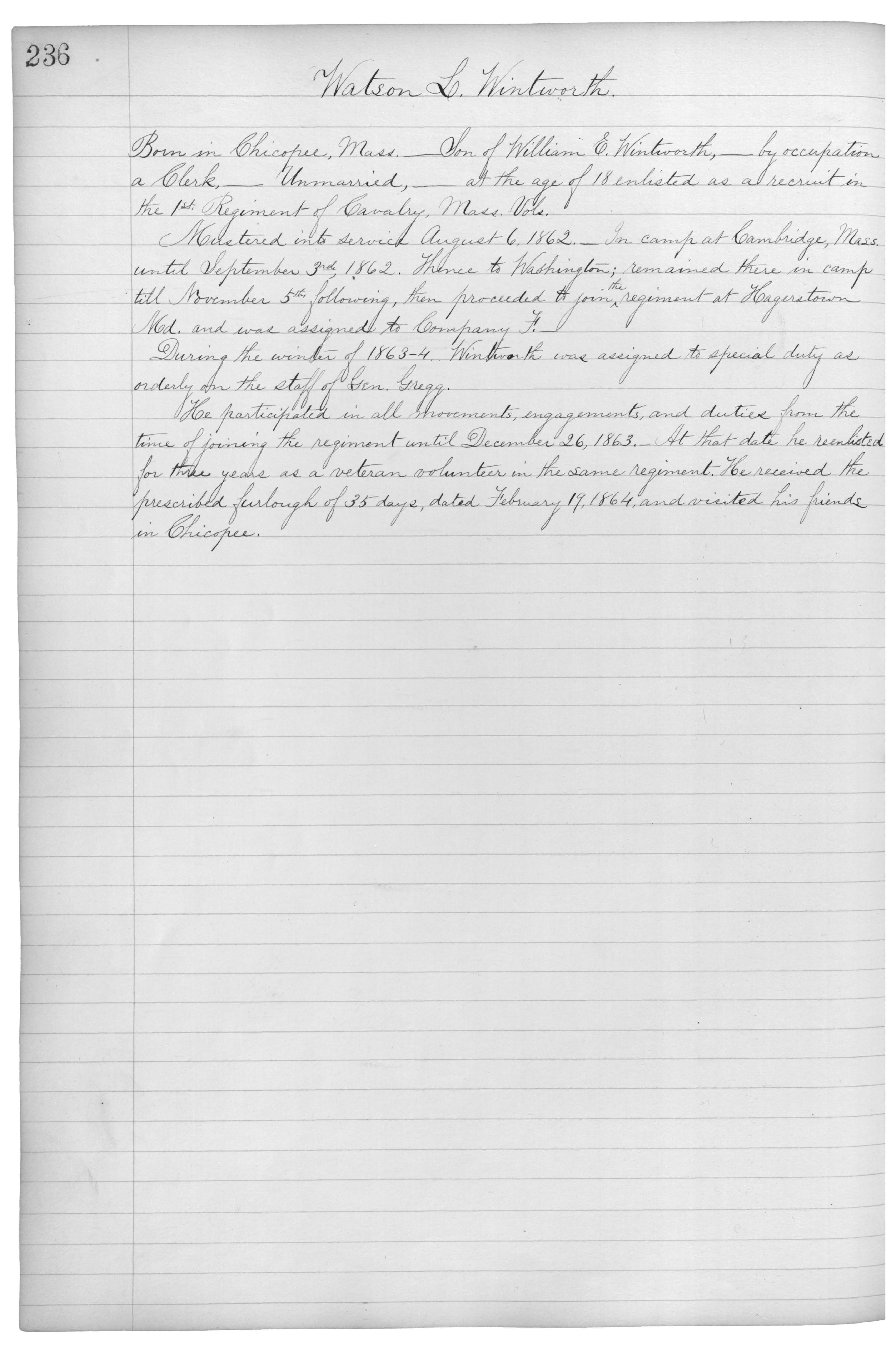 Born in Chicopee, Mass._Son of William E. Wintworth,_by occupation a Clerk,_Unmarried,_at the age of 18 enlisted as a recruit in the 1st Regiment of Cavalry, Mass. Vols.