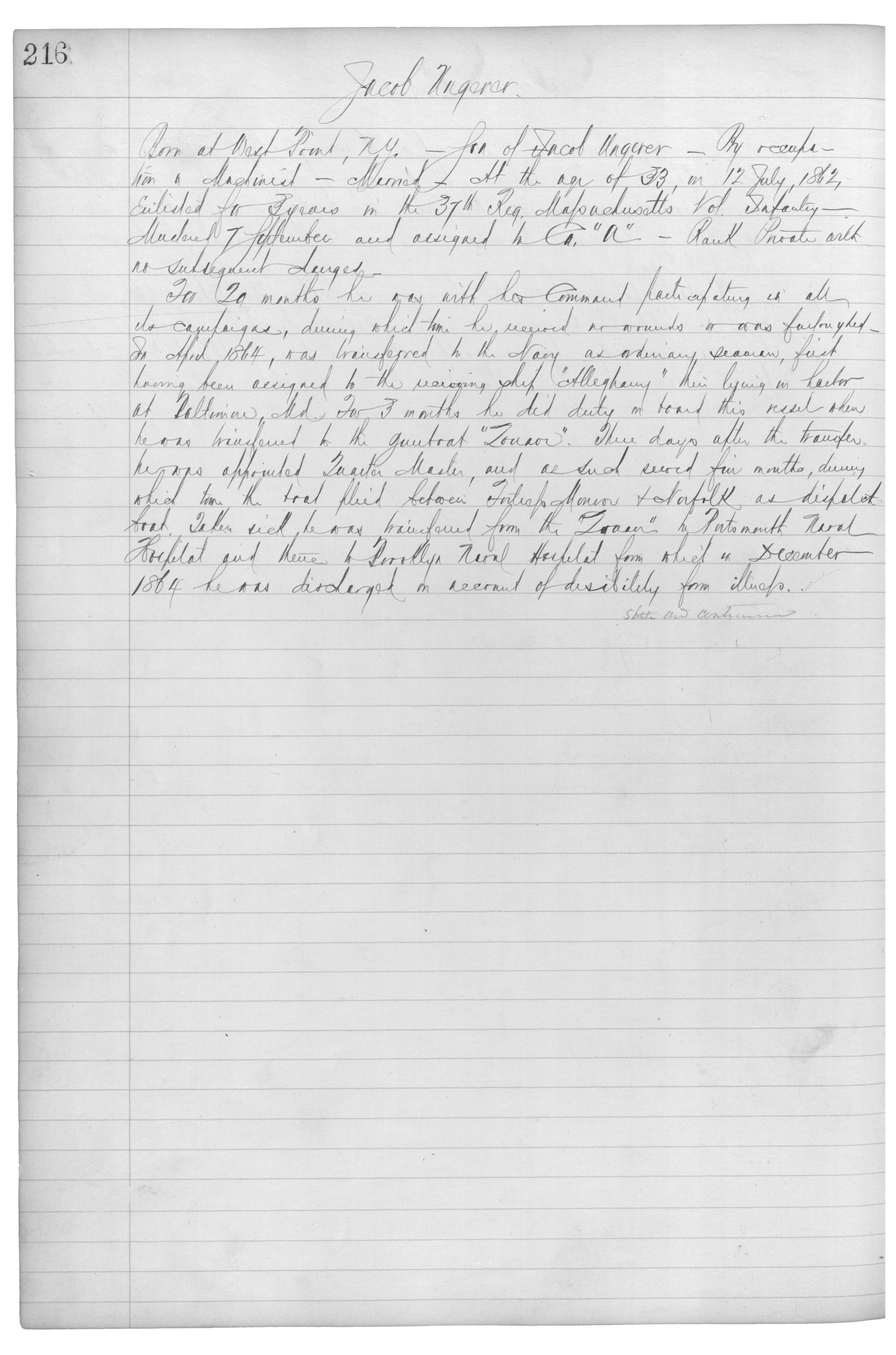 Born at West Point, N.Y._Son of Jaboc Ungerer_By occupation a Machiniest_Married_At the age of 33, on 12 July, 1862, enlisted for 3 years in the 37th Reg. Massachusetts Vol. Infantry_Mustered 7 September and assigned to Co. “A”_Rank Private with no subsequent changes._