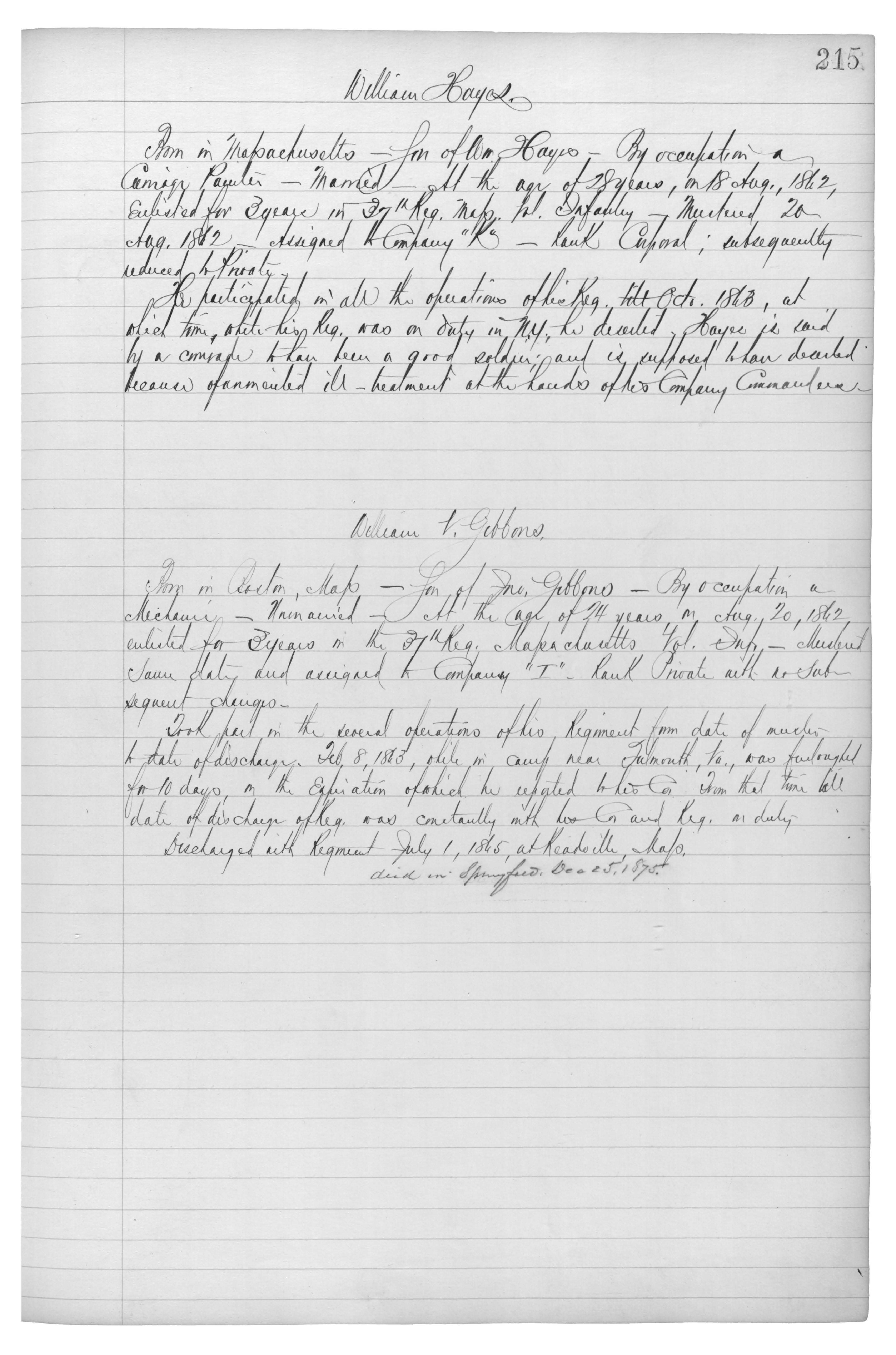 Born in Boston, Mass_son of {???} Gibbons_by occupation a Mechanic_Unmarried_At the age of 24 years on Aug. 20, 1862, enlisted for 3 years in the 37th Reg. Massachusetts Vol. Inf._Mustered same date and assigned to Company āIā_Rank Private with no subsequent changes.