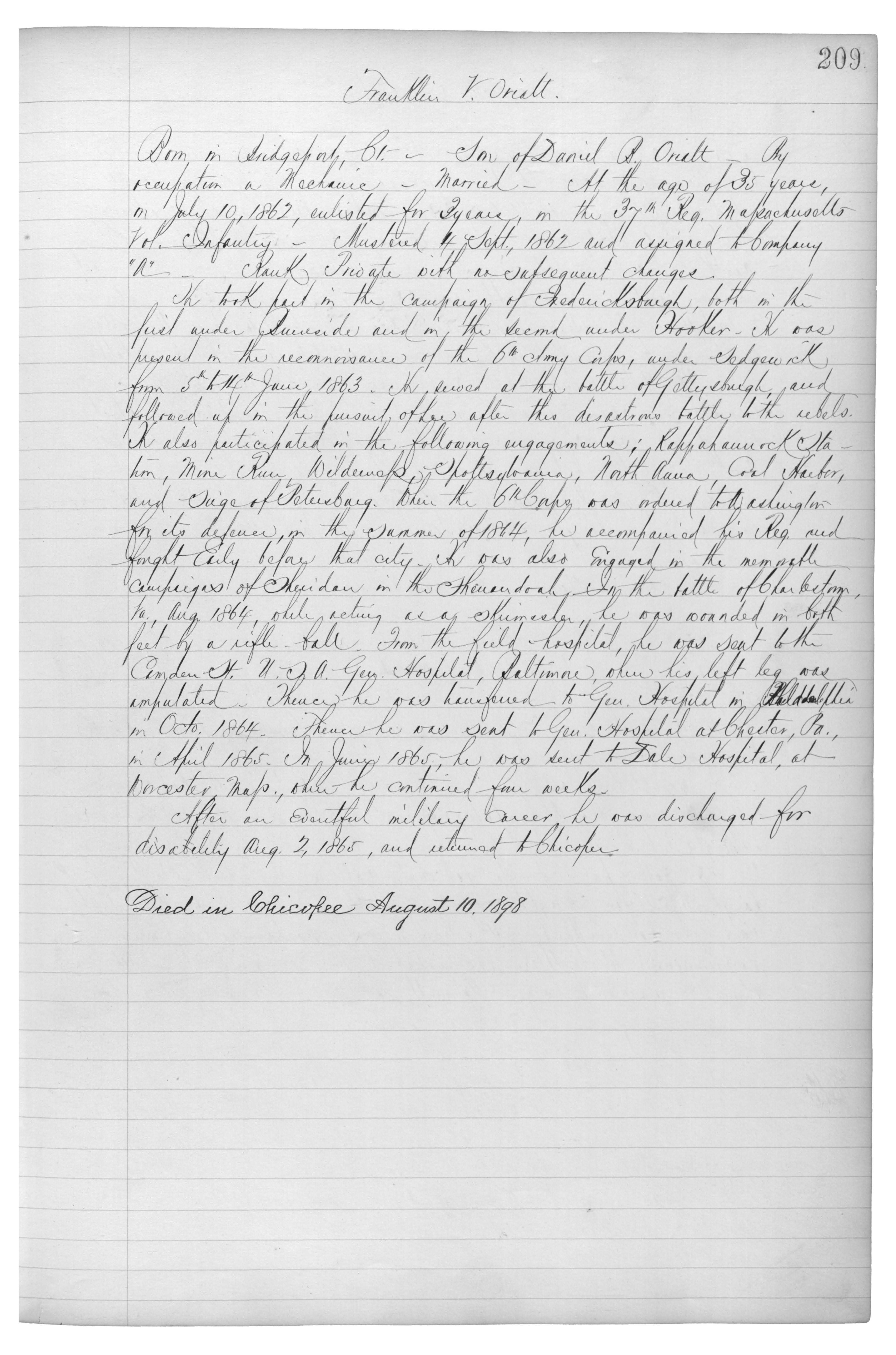 He took part in the campaign of Fredericksburgh, both in the field under Burnside and in the second under Hooker_He was present in the reconnaissance of the 6th Army Corps, under Sedgewick from 5th to 14th June, 1863. He served at the battle of Gettysburgh, and followed up in the pursuit of Lee after this {disastrious} battle to the rebels. He also participated in the following engagements: Rappahannock Station, Mine Run, Wilderness, Spottsylvania, North Anna, Coal Harbor, and siege of Petersburg, When the 6th Corps was ordered to Washington for its defense, in the summer of 1864, he accompanied his Reg. and fought {early} before that city. He was also engaged in the memorable campaigns of Sheridan in the Shenandoah. In the battle of {Charleton}, Va., Aug 1864, while acting as a skirmisher, he was wounded in both feet by a rifle ball. From the field hospital, he was sent to the Camden St. U.S.A Gen. Hospital, Baltimore, where his left leg was amputated. Thence he was transferred to Gen. Hospital in {???} in Octo. 1864. Thence he was sent to Gen. Hospital at {Chester}, Pa., in April 1865. In June 1865, he was sent to Dale Hospital, at Worcester Mass., where he continued for weeks.