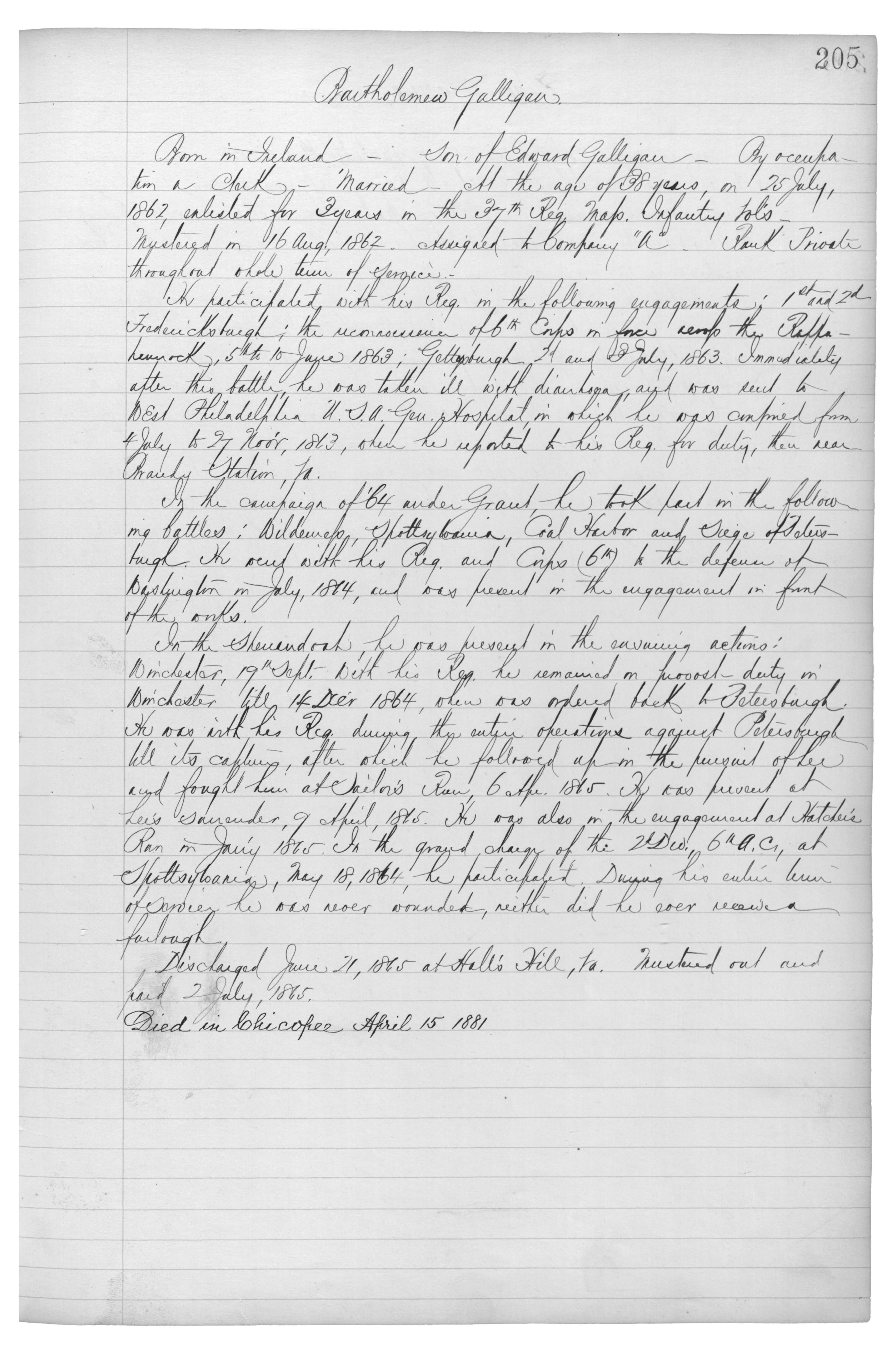 Born in Scotland_Son of Edward Galligan_By occupation a Clerk_Married_At the age of 38 years, on 25 July, 1862, enlisted for 3 years in the 37th Reg. Mass. Infantry Vol’s_Mustered on 16 Aug, 1862. Assigned to Company “A”_ Rank Private throughout whole term of service.