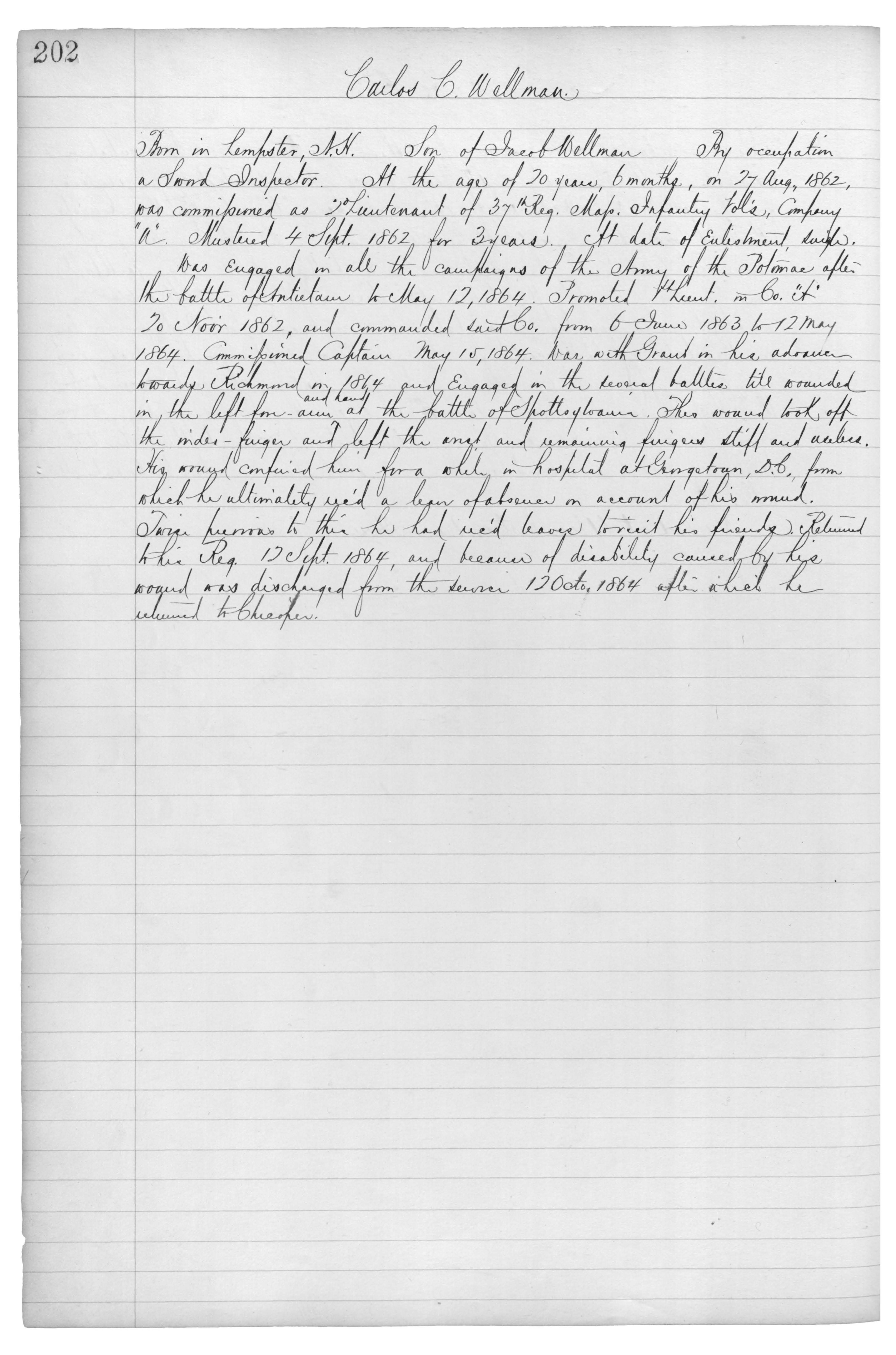 Born in Lempster, N.H._Son of Jacob Wellman_by occupation a {Sword} Inspector_At the age of 20 years, 6 months, on 27 Aug, 1862, was commissioned as 2d Lieutenant of 37th Reg. Mass. Infantry Vol’s, Company “A”. Mustered 4 Sept. 1862 for 3 years. At date of enlistment, {???}.