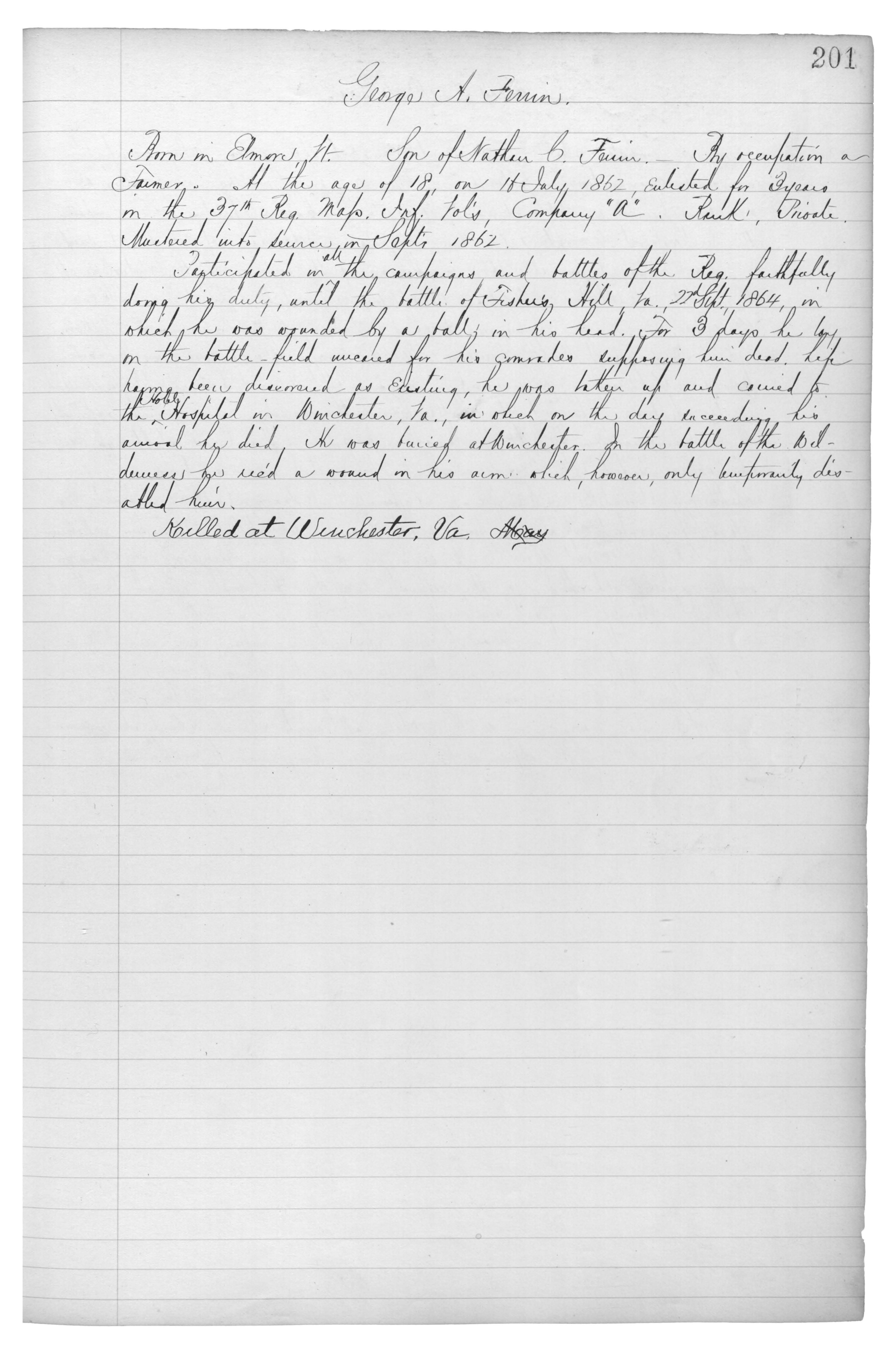 Participated in the campaigns and battles of the Reg. faithfully during his duty, until the battle of Fisher’s Hill, Va., 22 Sept., 1864, in which he was wounded by a ball in his head. For 3 days he lay on the battle-field {???} for his comrades supposing him dead. {???} {???}been discovered as existing, he was taken up and carried to the {???} Hospital in Winchester, Va., in which on the day succeeding his arrival he died. He was buried at Winchester. In the battle of the Wilderness he rec’d a wound in his arm which, however, only temporarily disabled him.