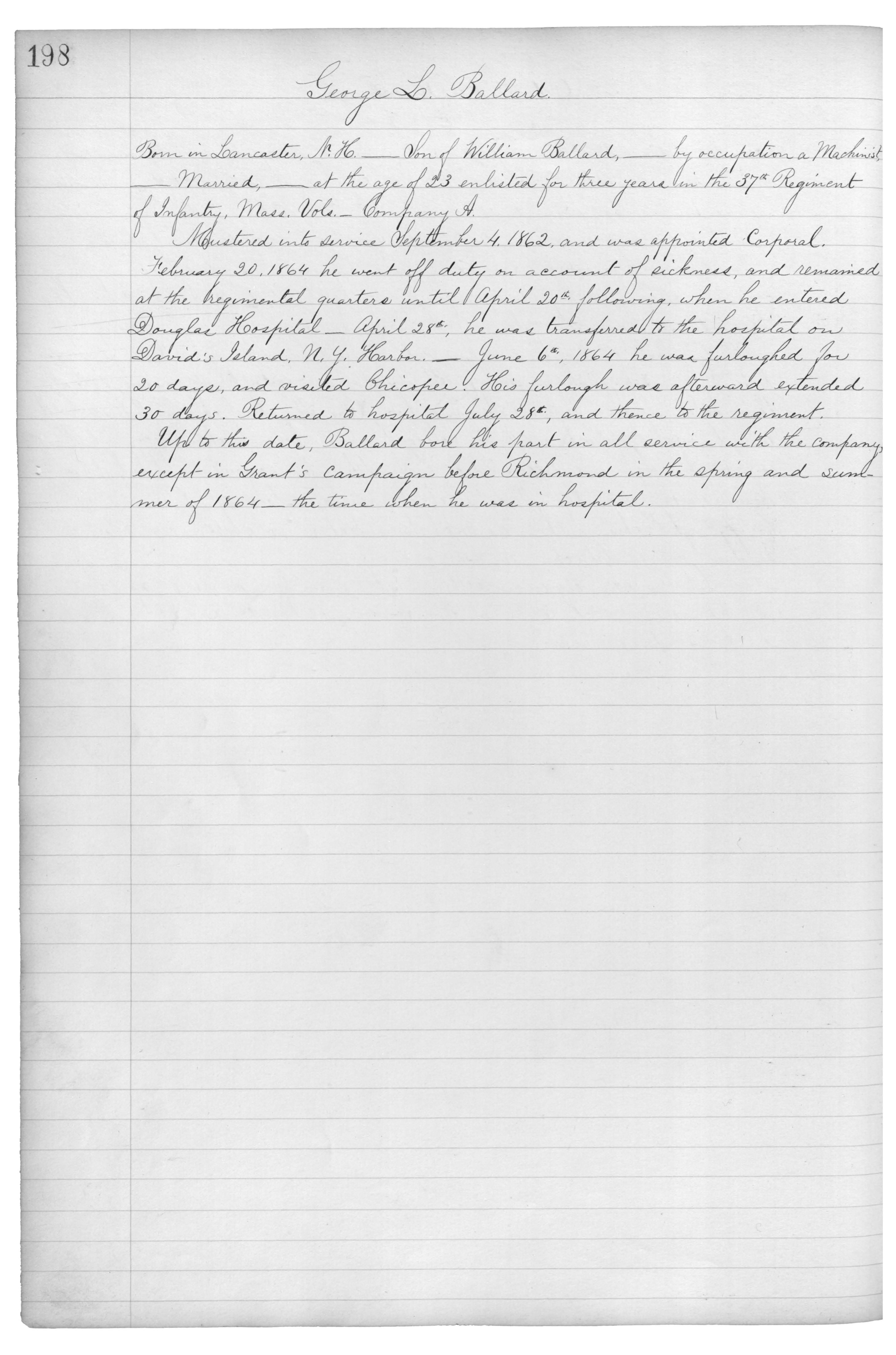 Born in Lancaster, N.H._Son of William Ballard,_by occupation a Machinist,_Married,_at the age of 23 enlisted for three years in the 37th Regiment of Infantry, Mass. Vols._Company A.