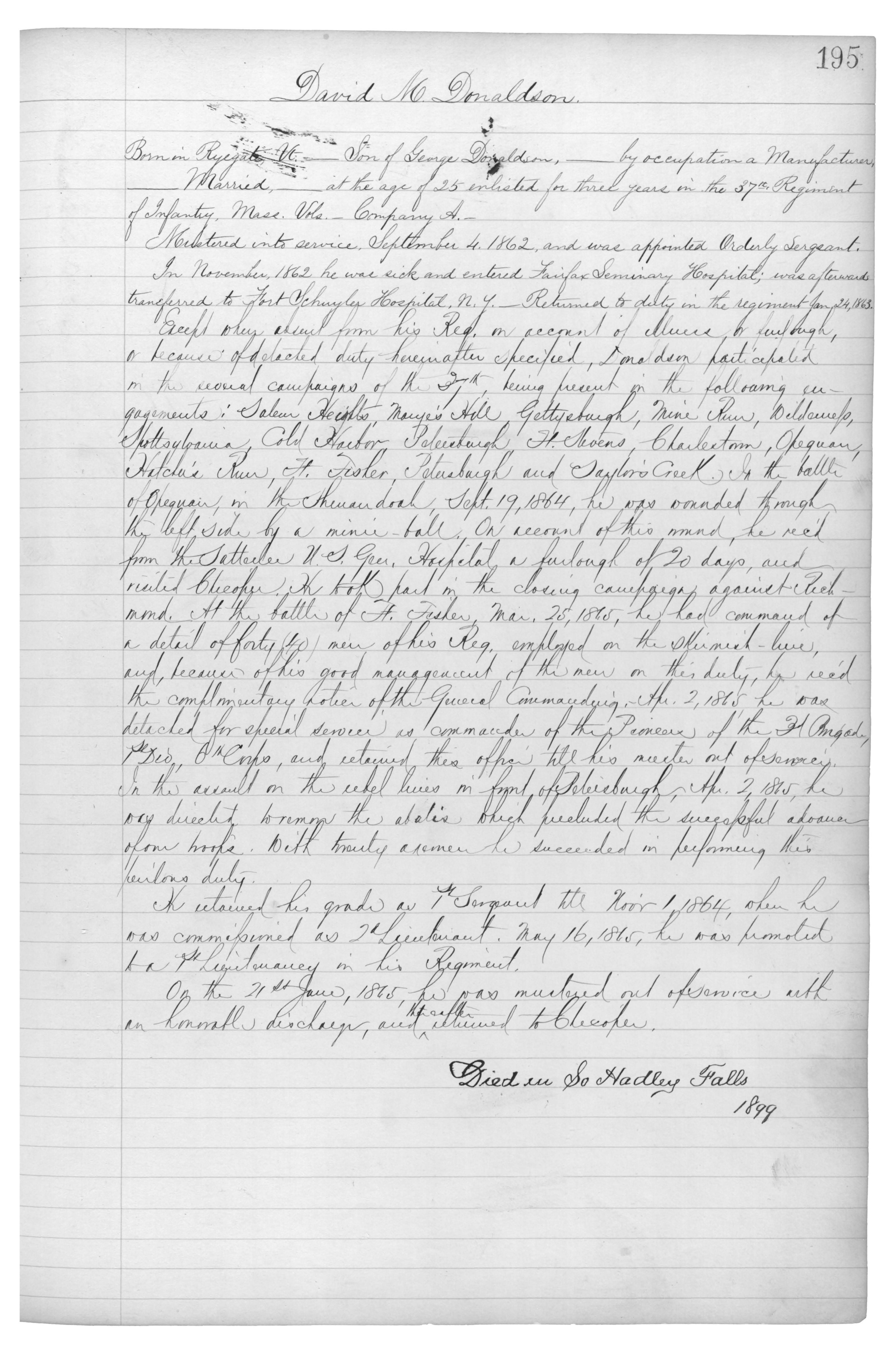 Born in {Ryegate}, Vt._Son of George Donaldson,_by occupation a Manufacturer,_Married,_at the age of 25 enlisted for three years in the 37th Regiment of Infantry, Mass. Vols._Company A._