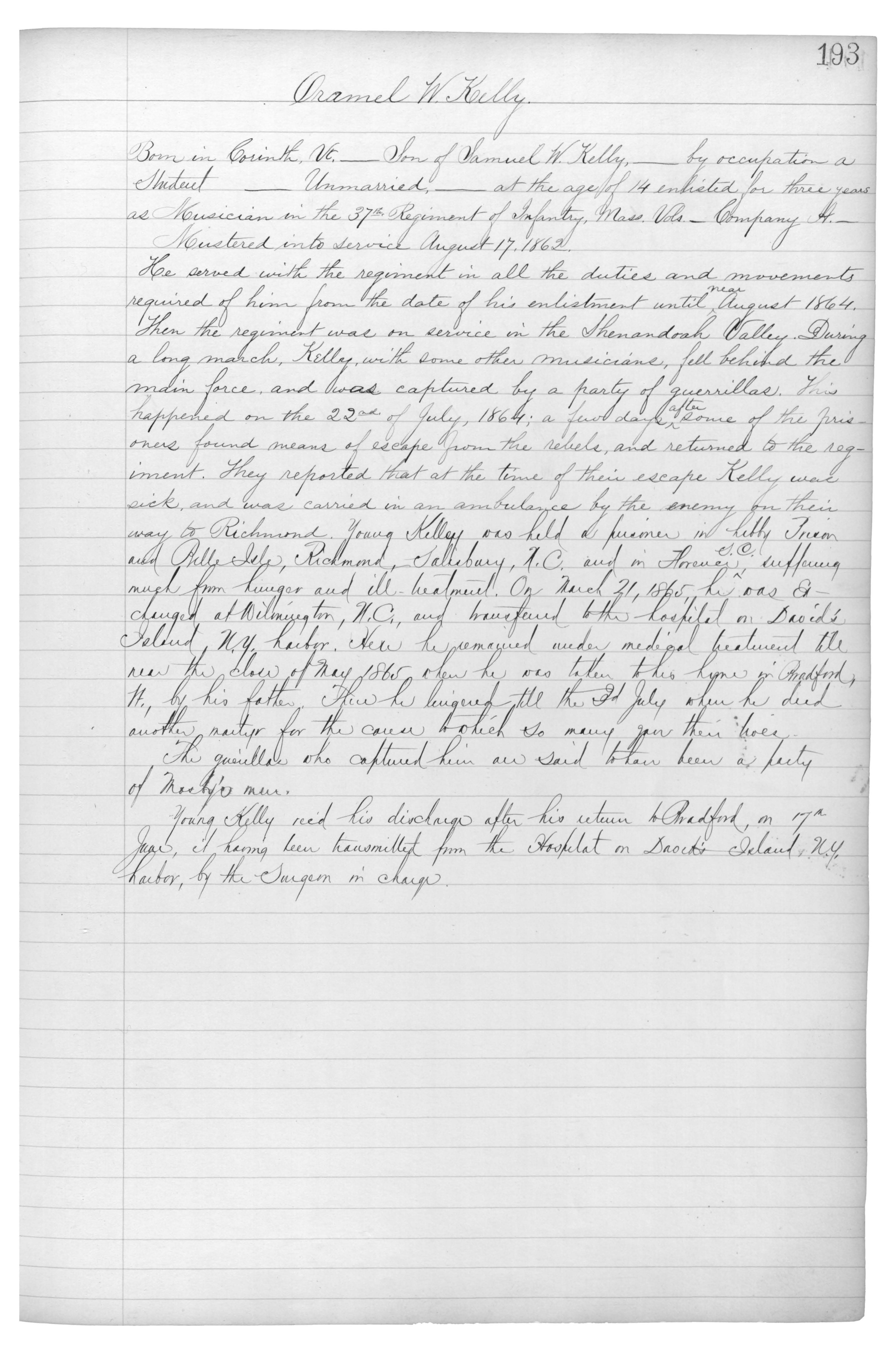 Born in Corinth, Vt._Son of Samuel W. Kelly,_by occupation a Student_Unmarried,_at the age of 14 enlisted for three years as Musician in the 37th Regiment of Infantry, Mass. Vols._Company A._Mustered into service August 17, 1862.