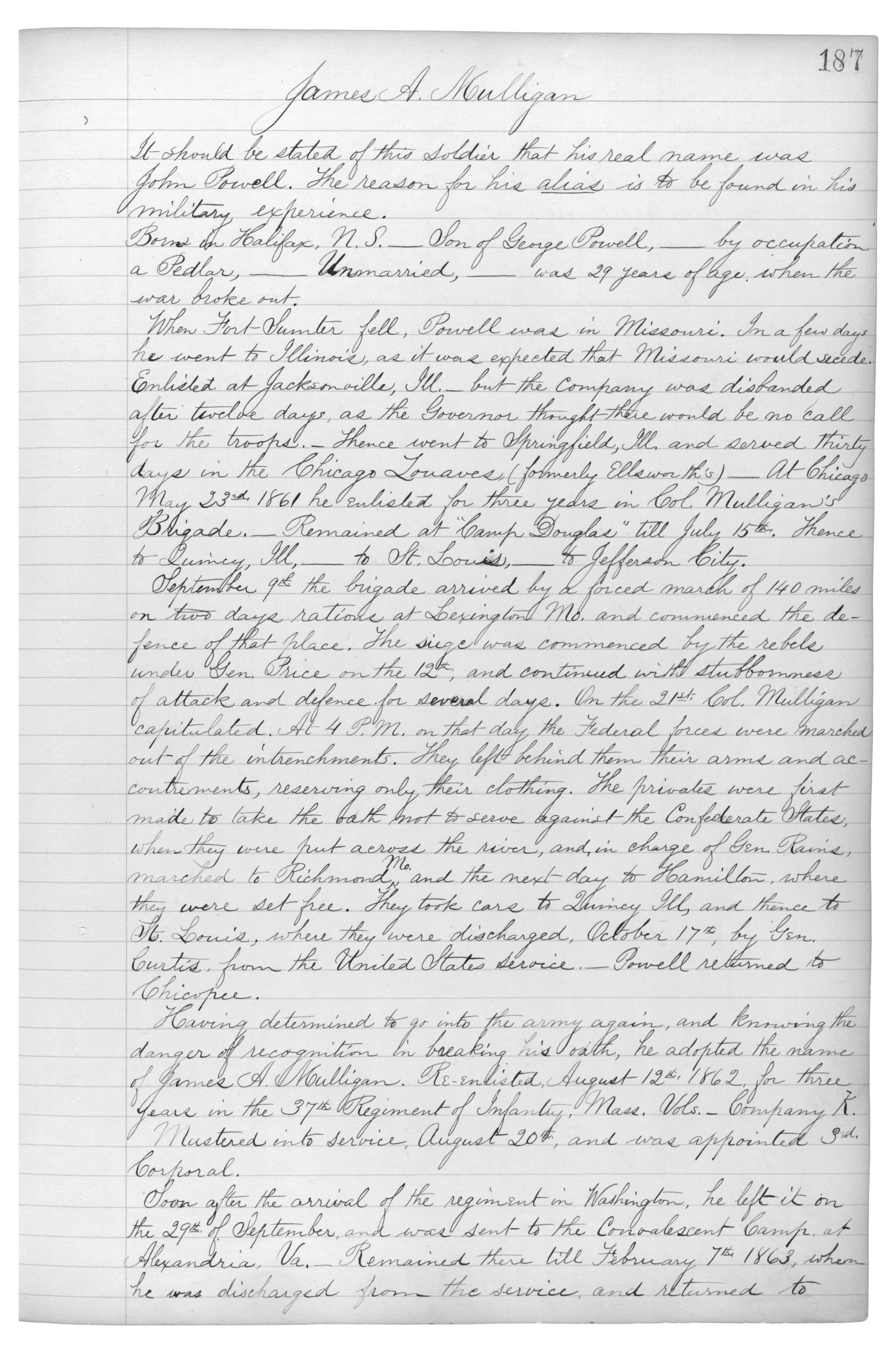 Having determined to go into the army again, and knowing the danger of recognition in breaking his oath, he adopted the name of James A. Mulligan. Re-enlisted August 12th 1862 for three years in the 37th Regiment of Infantry, Mass. Vols._Company K.