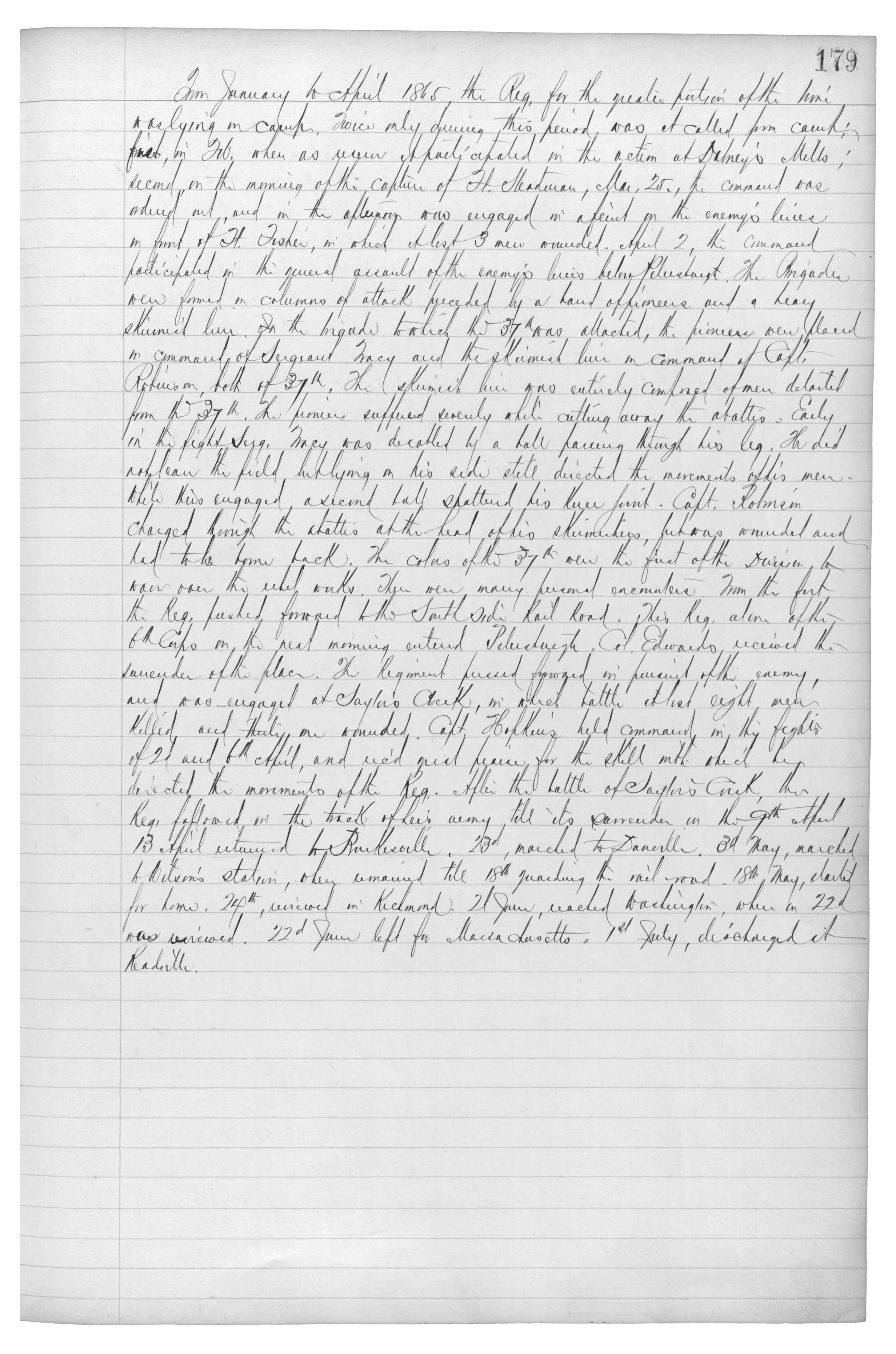 From January to April 1865, the Reg. for the greater portion of the {???} was lying in camp. Twice {???} {???} this period was at called {???} camp: {???} in Feb. when as {???} participated in the action at {Dalney’s Mills}; second in the {???} of the capture of Ft. {Stedman}, {???} 25., the command was {???} out, and in the afternoon was engaged in a feint on the enemy’s lines in front of Ft. {Fisher}, in which, at {least} 3 men wounded. April 2, the command participated in the {renewed} assault of the enemy’s lines below {Petersburgh}. The Brigade now formed in columns of attack preceded by a {???} {???} and a heavy skirmish line. In the brigade to which the 37th was attached, the {???} {???} {???} in command of Sergeant {Tracy} and the skirmish line in command of Capt. Robinson, both of 37th. The skirmish line was entirely composed of men detailed from the 37th. The {???} suffered severely while {???} {???} the {???}. Early in the fight Serg. {Mey} was {???} by a ball passing through his leg. He did not leave the field but lying on his side still directed the movements of his men. While {???} engaged a second ball shattered his knee joint. Capt. Robinson charged through the {???} at the head of his skirmishers, but was wounded and had to be {???} back. The colors of {???} 37th {???} the {???} of the division to {???} over the rebel works. There {men} {???} {???} {???}. From the first, the Reg. pushed forward to {his} Southside Rail Road. This Reg. {alone} of the 6th Corps on the next morning entered Petersburgh. Col. Edwards received the surrender of the place. The Regiment pushed forward in pursuit of the enemy, and was engaged at {Saylas} Creek, in which battle at least eight men killed and {thirty} {more} wounded. Capt. Hopkins held command in the {fights} of 2d {???}, {???} {???} and {???} {???}, for the skill with which he directed the movements of the Reg. After the battle of {Saylors} {Creek}, the Reg. followed in the track of his army till its surrender on the 9th {???} 13 april returned to {Ruskesville}. 23d, marched to {Doverlle}. 3d May, marched to {Wilson’s} station, where remained till 18th guarding the rail-road. 18th May, {???} for home. 24th, arrived in Richmond. 21 {June}, reached Washington, where on 22d was reviewed. 22d June left for Massachusetts. 1st July, ,discharged at {Readville}.