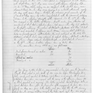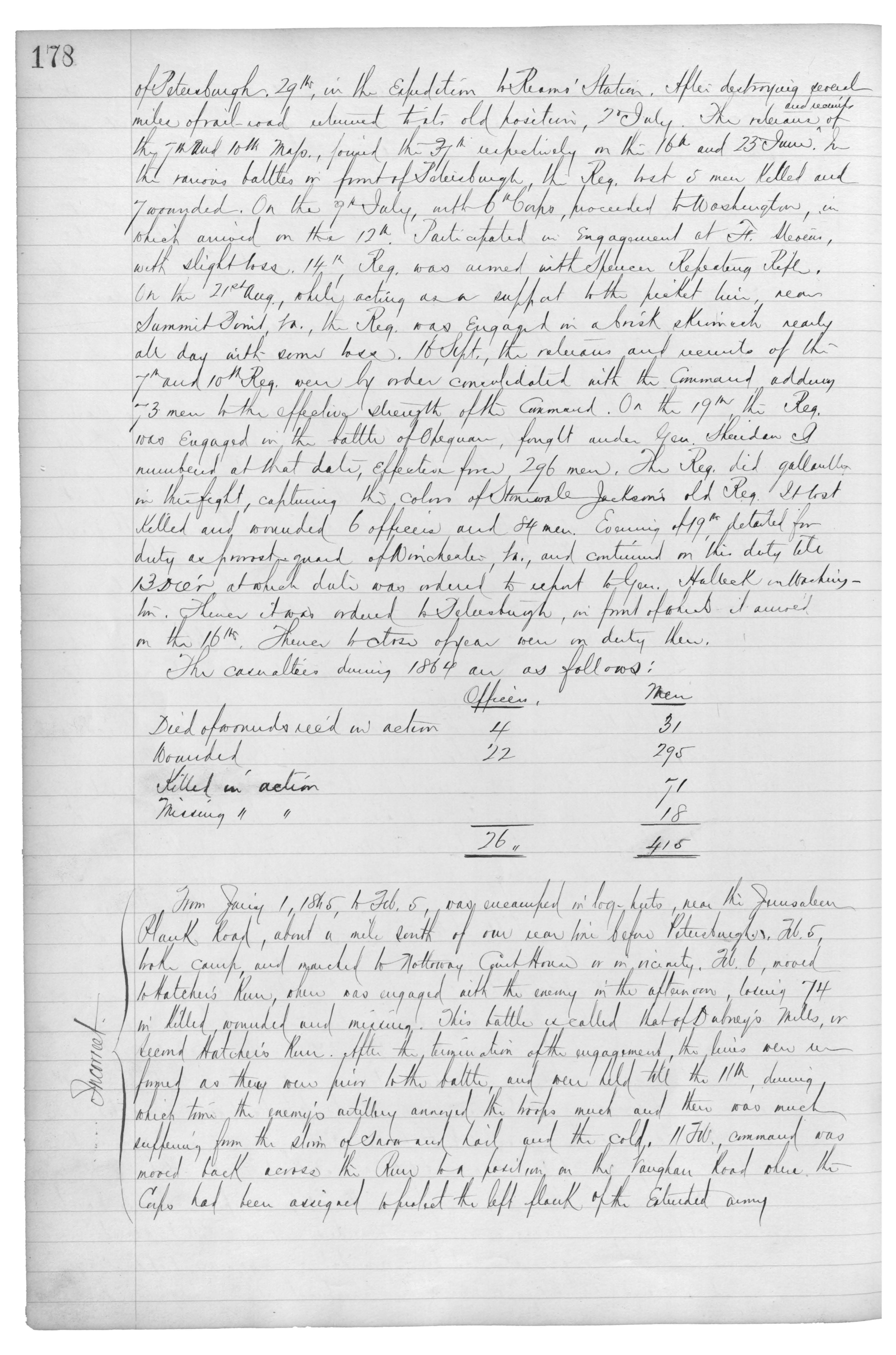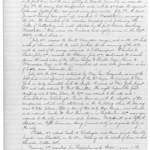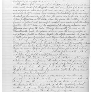 From {Jany} 1, 1865, to Feb. 5, was encamped in log-huts, near the {Jerusalem} {Plank} Road, about a mile {???} of our rear line before Petersburgh. Feb. 5,{???} camp and marched to {Notteray} Court House in vicinity. Feb. 6, moved to {Hotchis} {River}, where was engaged with the enemy in the afternoon, losing 74 in killed, wounded and missing. This battle is called that of {Dabney’s} Mills, or Second {Hotchis} River. After the termination of the engagement, the {lines} {new} reformed as they {now} {???} to the battle, and were held till the 11th, during which time the enemy’s artillery annoyed the troops much and there was much suffering from the storm of {???} and hail and the cold. 11 {Febs}, command was moved back across the River to a position on the {Vaugnes} Road where the Corps had been assigned to protect the left flank of the {???} army.