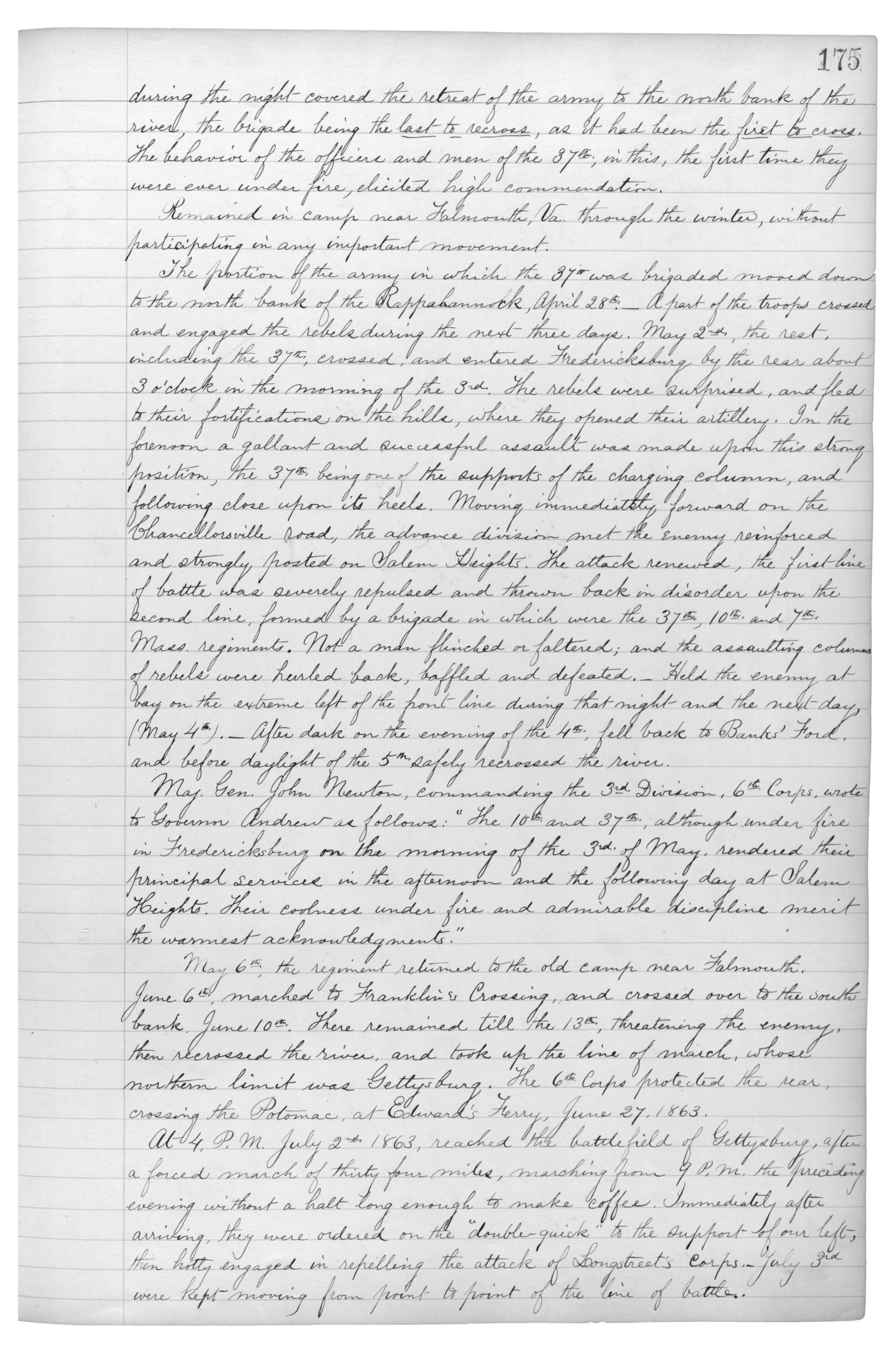 The portion of the army in which the 37th was brigaded moved down to the north bank of the Rappahannock, April 28th._A part of the troops crossed and engaged the rebels during the next three days. May 2nd, the rest, including the 37th, crossed, and entered Fredericksburg by the rear about 3o’clock in the morning of the 3rd. The rebels were surprised, and fled to their fortifications on the hills, where they opened their artillery. In the {forenoon} a gallant and successful assault was made upon this strong position, the 37th being one of the supports of the charging column, and following close upon its heels. Moving immediately forward on the Chancellorsville road, the advance division met the enemy reinforced and strongly posted on Sallem Heights. The attack renewed, athe first line of battle was severely repulsed and thrown back in disorder upon the second line, formed by a brigade in which were the 37th, 10th, and 7th, Mass. Regiments. Not a man flinched or faltered; and the assaulting columns of rebels were hurled back, baffled and defeated._Held the enemy at bay on the extreme left of the front line during that night and the next day, (May 4th)._After dark on the evening of the 4th, fell back to Banks’ Ford, and before daylight of the 5th safely recrossed the river.