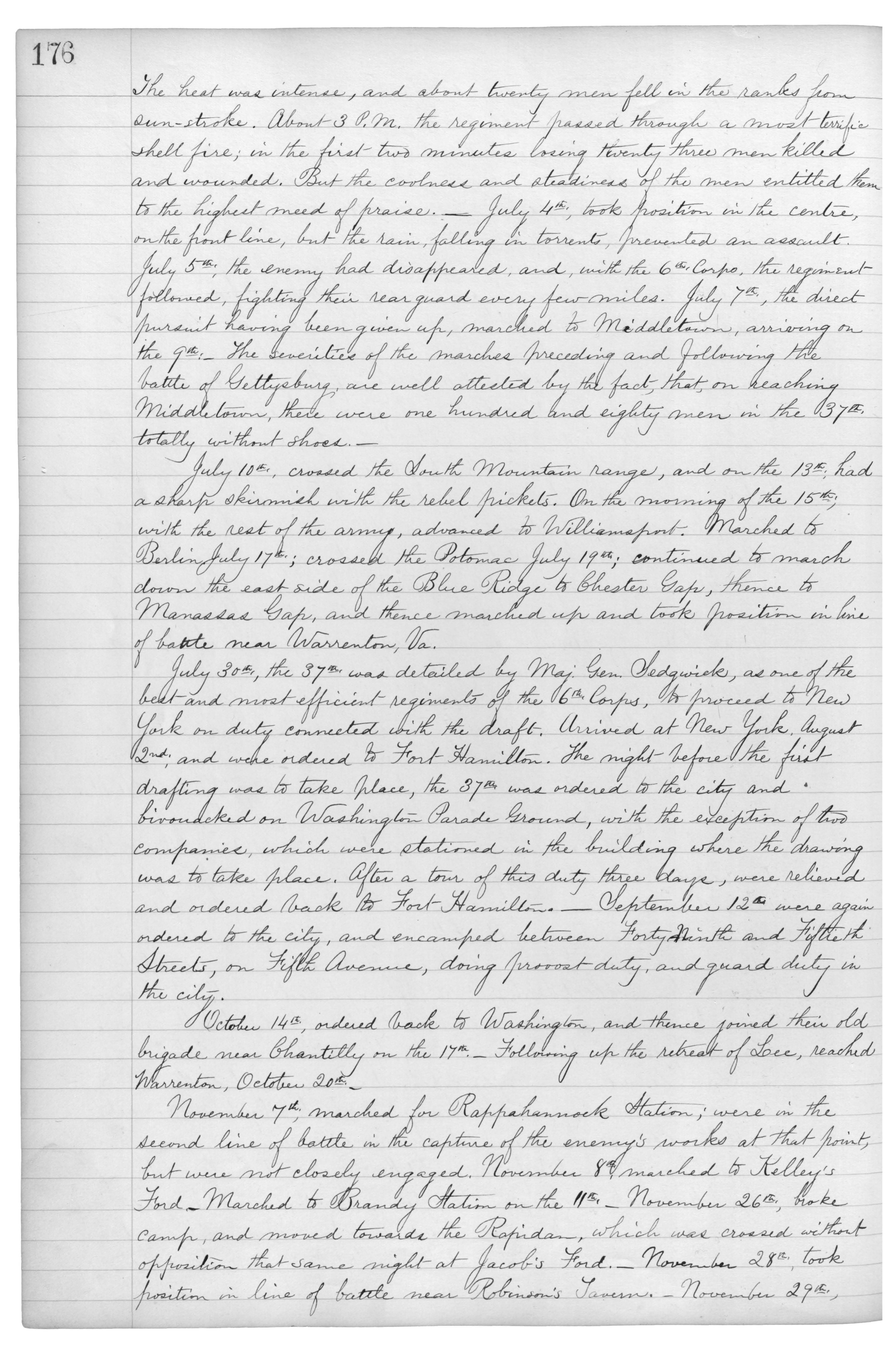 The heat wsa intense, and about twenty men fell in the ranks from sun-stroke. About 3 P.M. the regiment pssed through a most terrific shell fire; in the first two minutes losing twenty three men killed and wounded. But the coolness and steadiness of the men entitled them to the highest need of praise._July 4th., took position in the centre, on the front line, but the rain, falling in torrents, prevented an assault. July 5th: the enemy had disappeared, and, with the 6th Corps, the regiment followed, fighting their rear guard every few miles. July 7th, the direct pursuit having been given up, marched to Middletown, arriving on the 9th:_ The severities of the marches preceding and following the battle of Gettysburg are well attested by the fact that on reaching Middletown, there were one hundred and eighty men in th e37th totally without shoes._