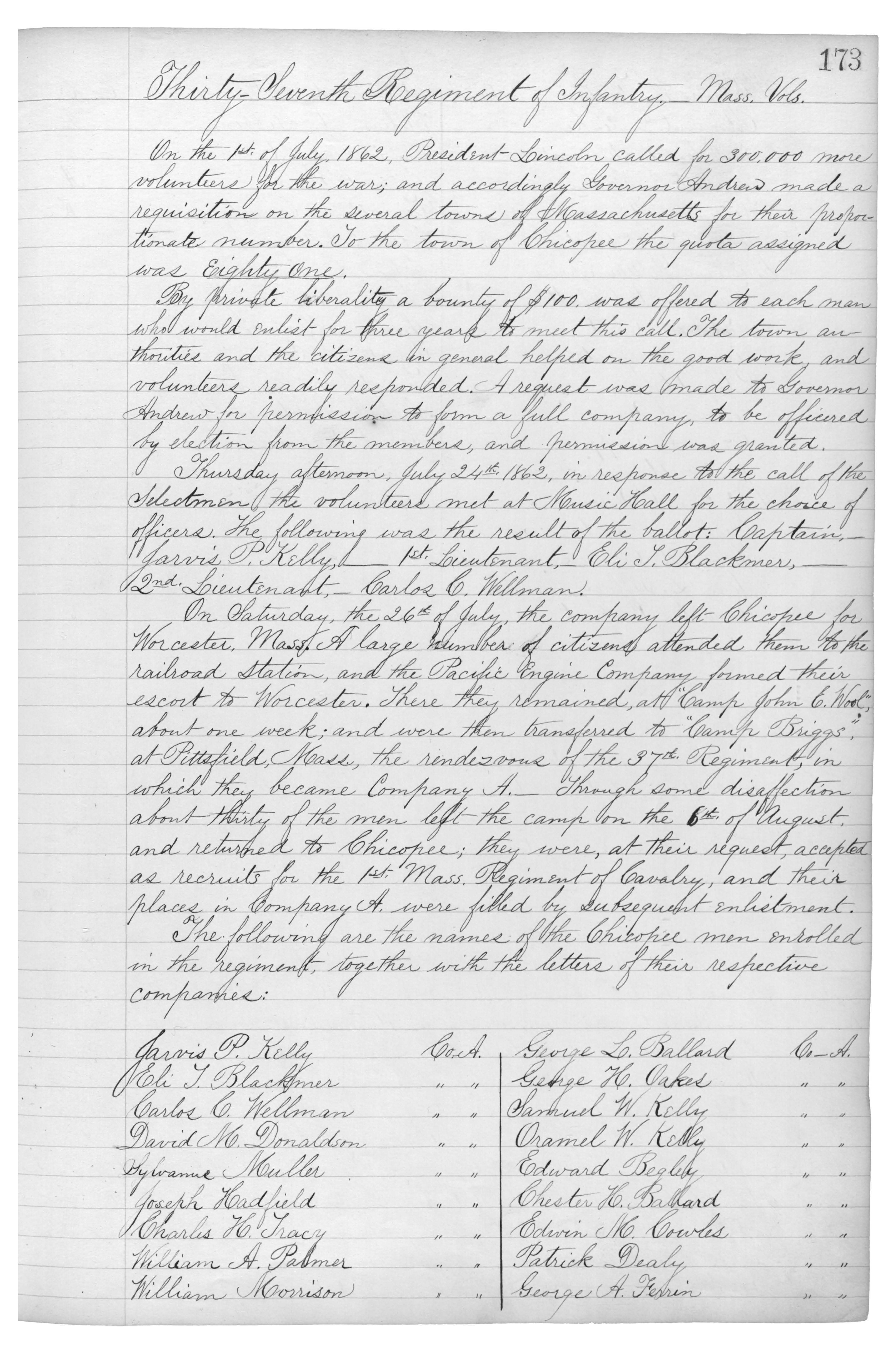 Thursday afternoon, July 24th 1862, in response to the call of the Selectmen, the volunteers met at Music Hall for the choice of officers. The following was the result of the ballot: Captain,_Jarvis P. Kelly,_1st. Lieutenant,_Eli L. Blackmer,_2nd. Lieutenant,_Carlos C. Wellman.