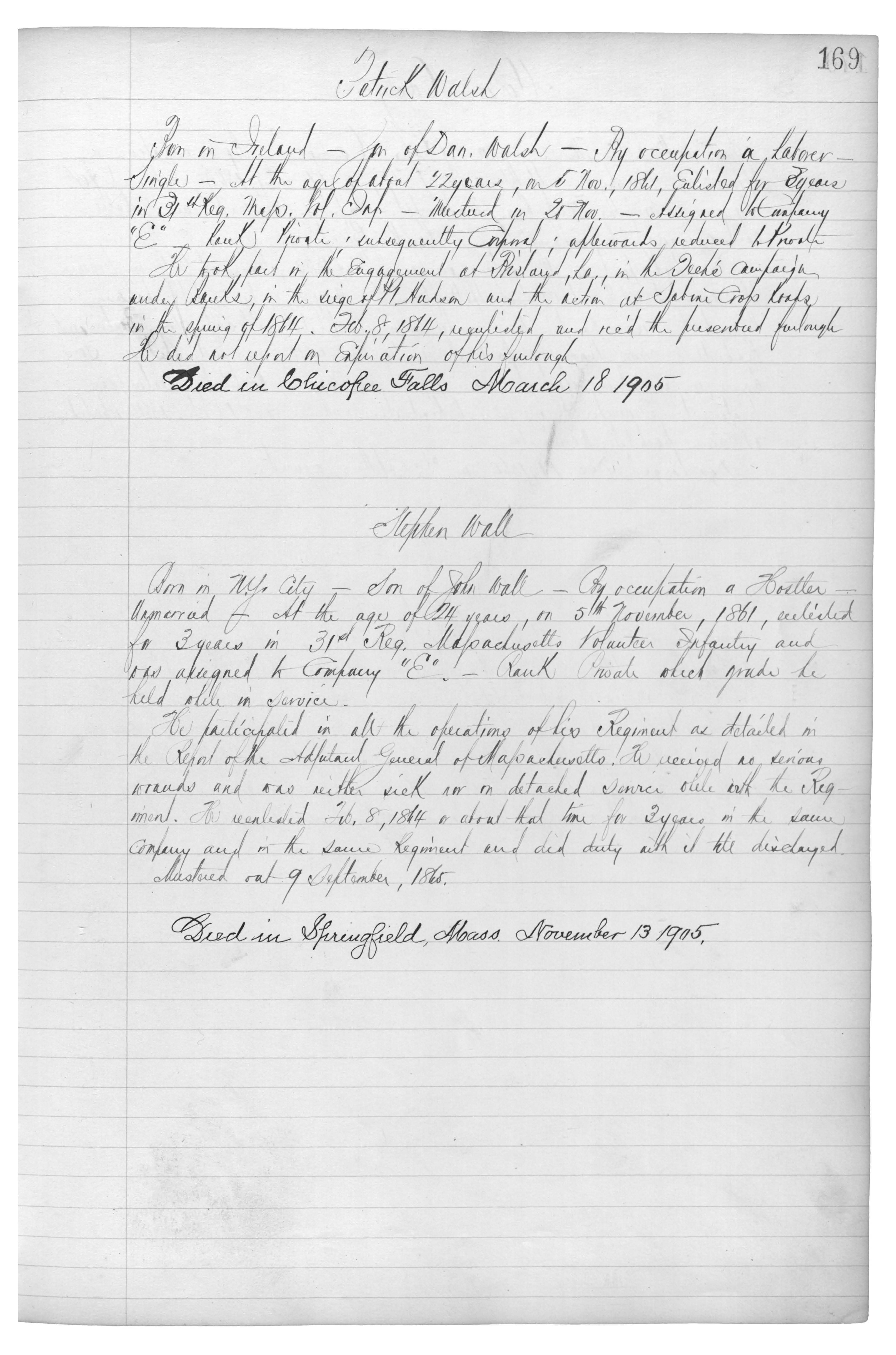 Born in Ireland_Son of Don. Walsh_By occupation a Laborer_Single_At the age of about 22 years, on 5 Nov. 1861, Enlisted for 3 years in 31st Reg. Mass. Vol. Inf_Mustered on 20 Nov._Assigned to Company “E”_Rank Private, subsequently Corporal; afterwards reduced to Private.