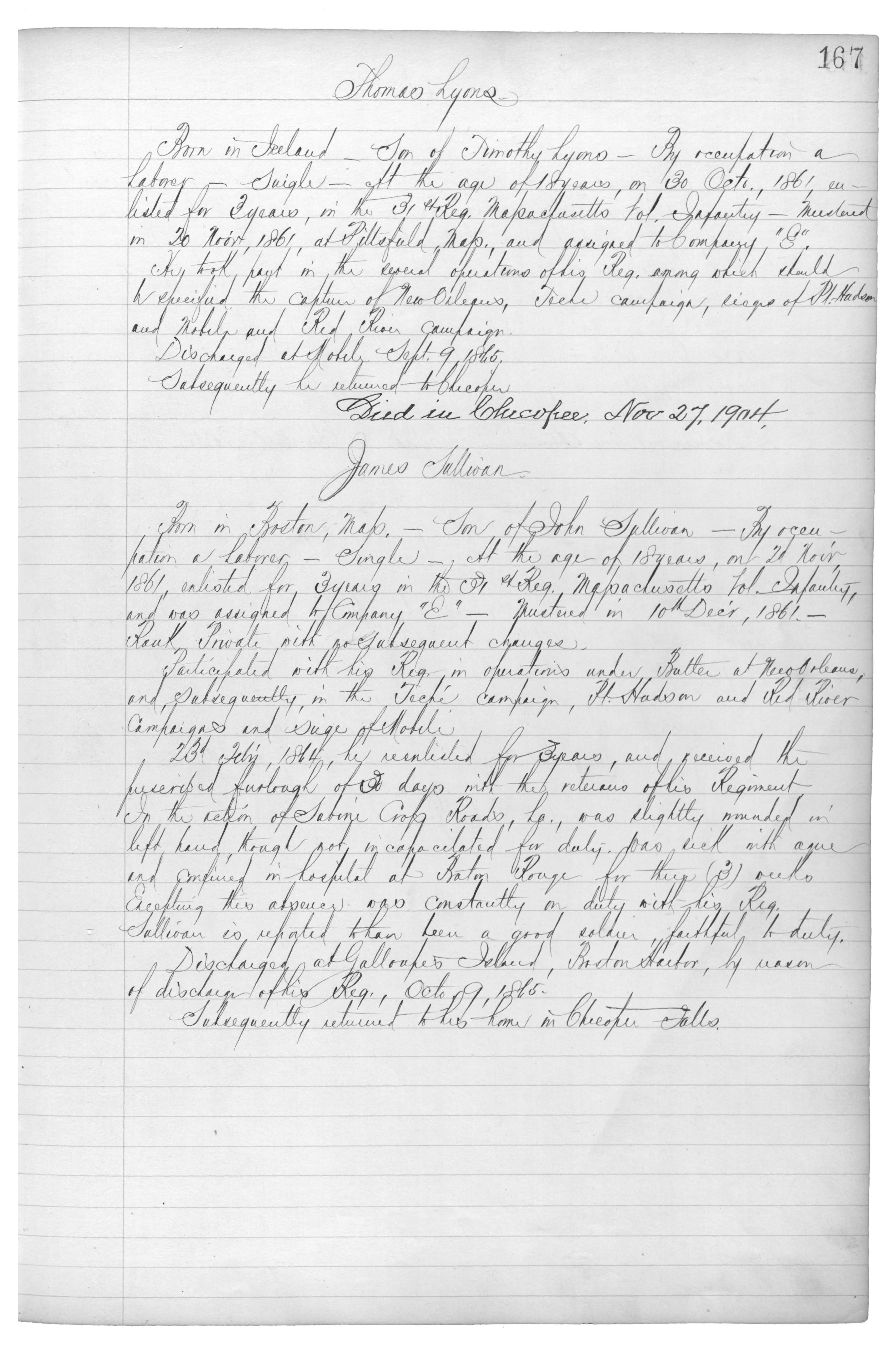 Born in Ireland,_Son of Timothy Lyons,_By occupation a Laborer_Single_at the age of 18 years, on 30 Octo., 1861, enlisted for 3 years, in the 31st Reg. Massachusetts Vol. Infantry_Mustered in 20 {Mar}, 1861, at Pittsfield, Mas., and assigned to Company “E”.