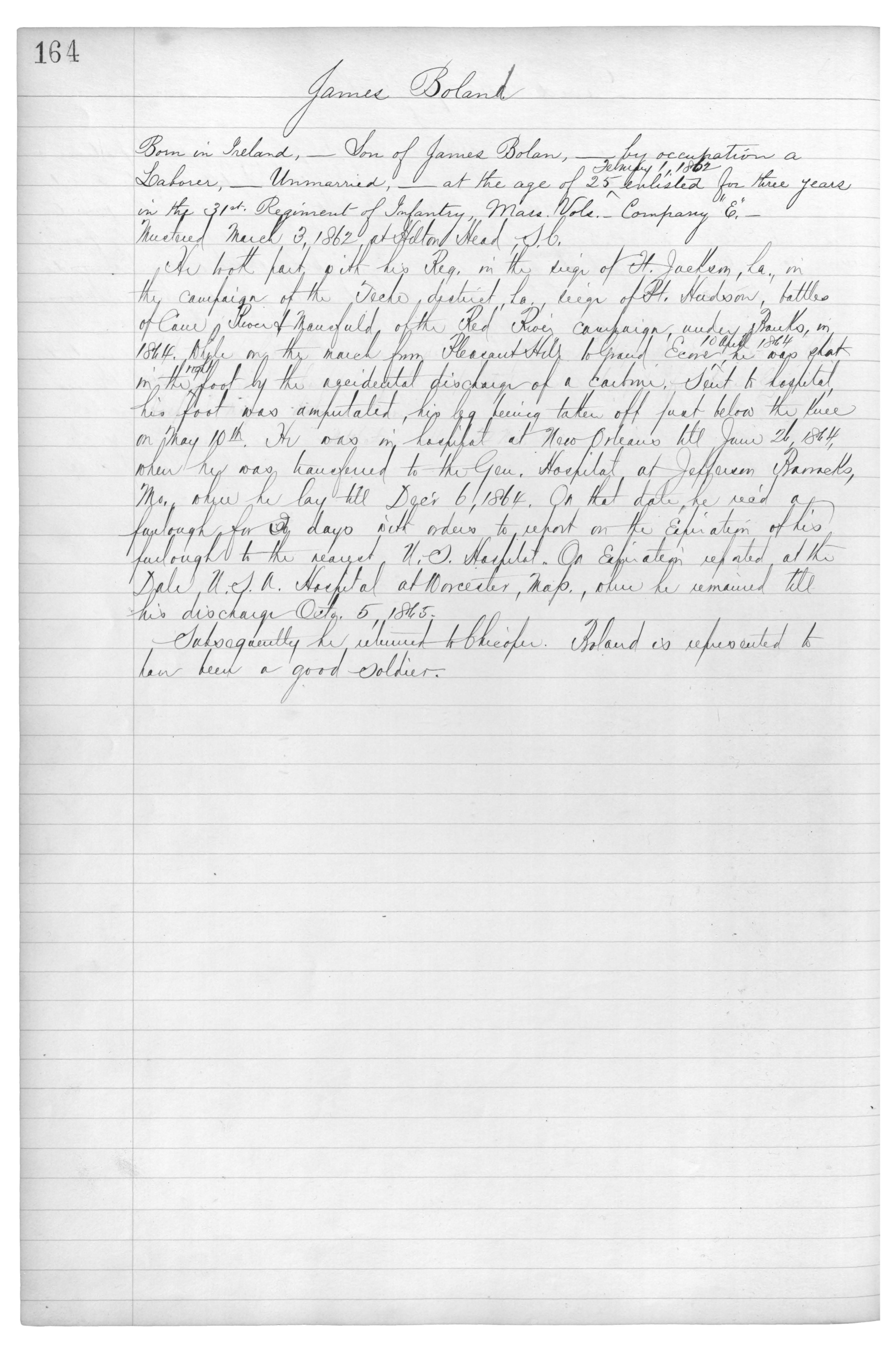 Born in Ireland,_Son of James Bolan,_by occupation a Laborer,_Unmarried,_at the age of 25, February 1, 1862, enlisted for three years in the 31st Regiment of Infantry, Mass. Vols._Company “E”._Mustered March 3, 1862 at {faland} Head S.C.