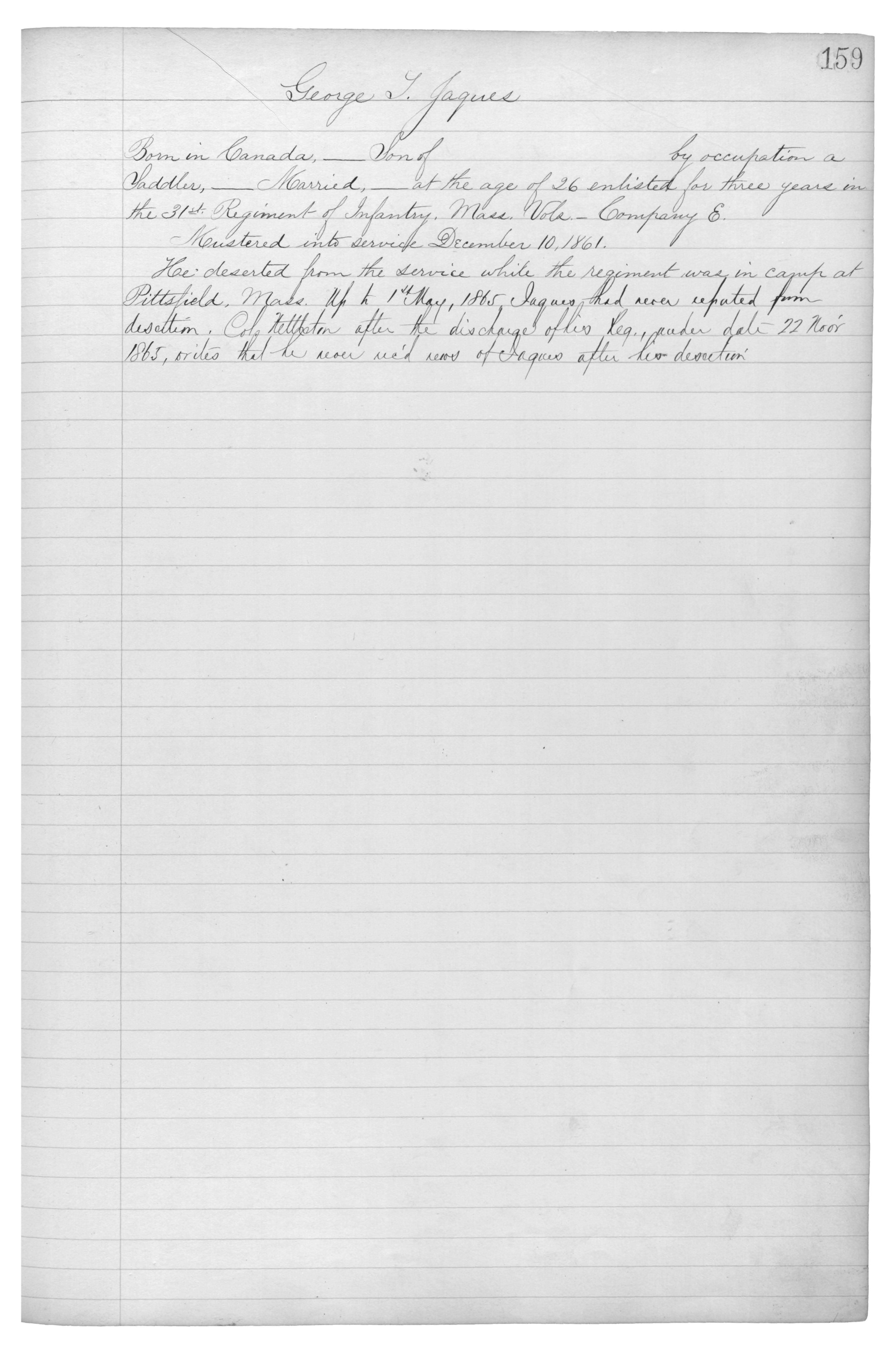 He deserted from the service while the regiment was in camp at Pittsfield, Mass. {???} 1st May, 1865. Jacques had never {reputed} from desertion. Col. Nettleton after the discharge of his Reg., {order} date 22, Nov. 1865, write that he never {???} {???} of Jacques after his desertion.