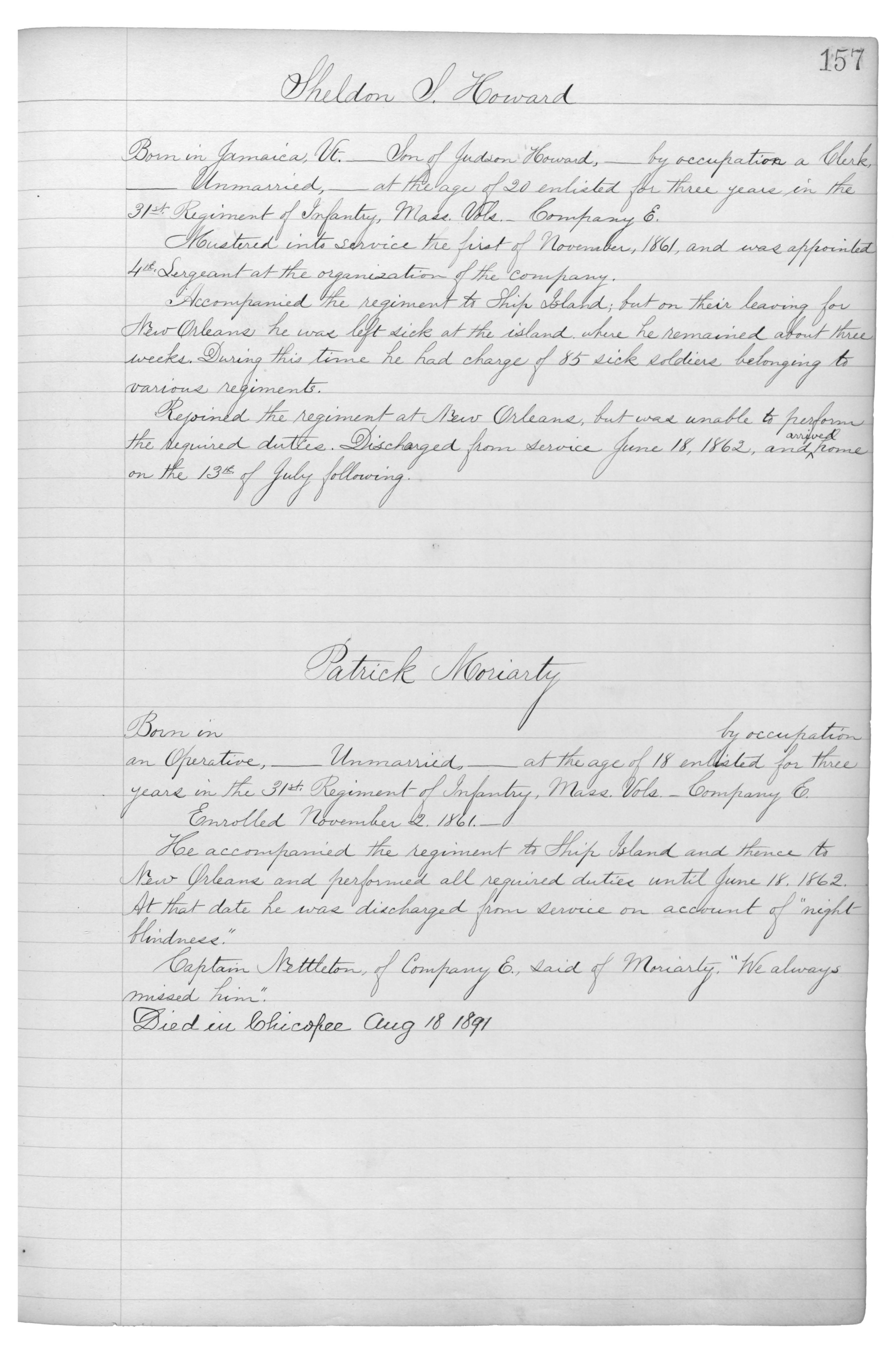 Born in Jamaica, Vt._Son of Judson Howard,_by occupation a Clerk,_Unmarried_at the age of 20 enlisted for three years in the 31st Regiment of Infantry, Mass. Vols._Company E.