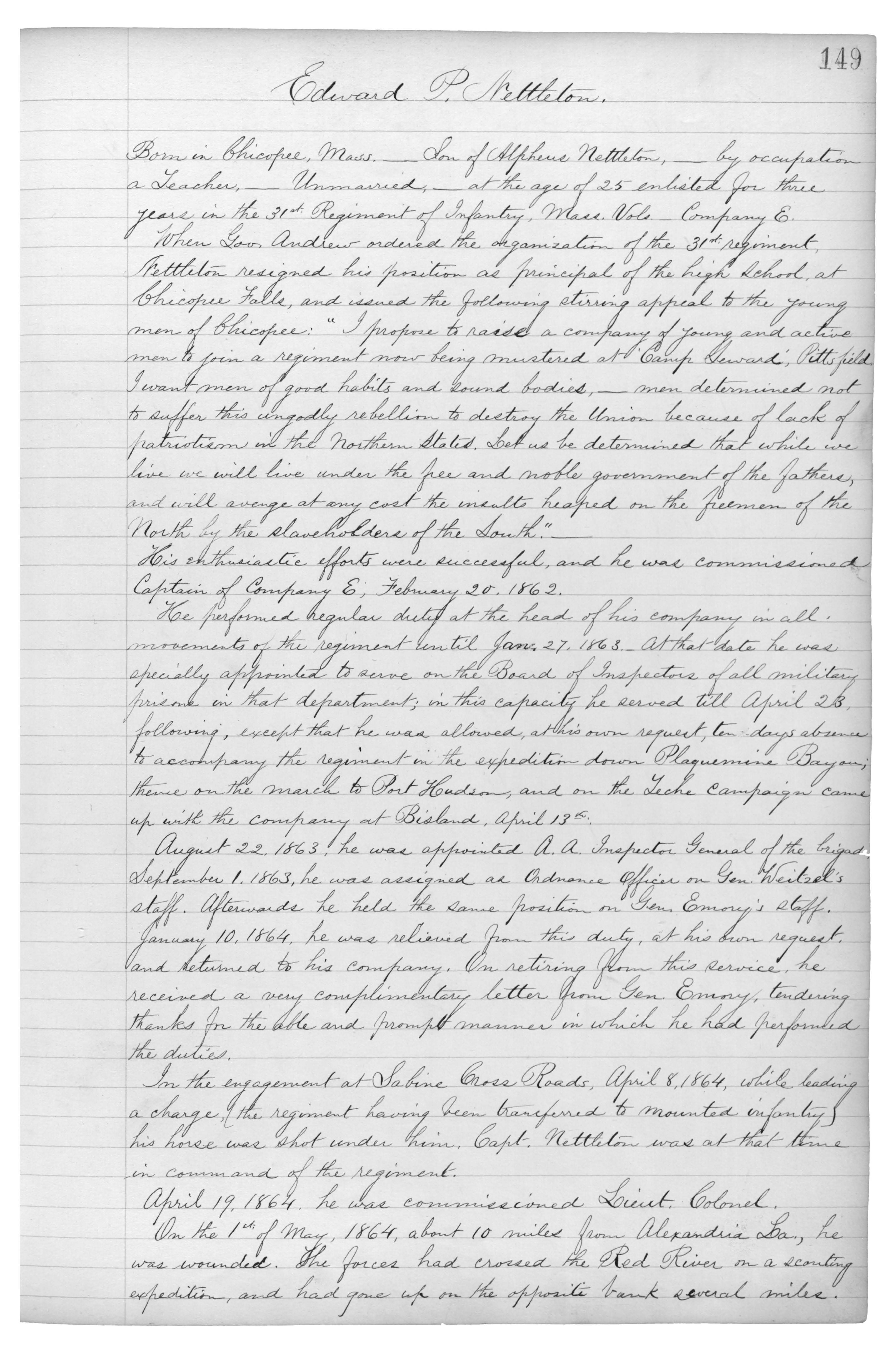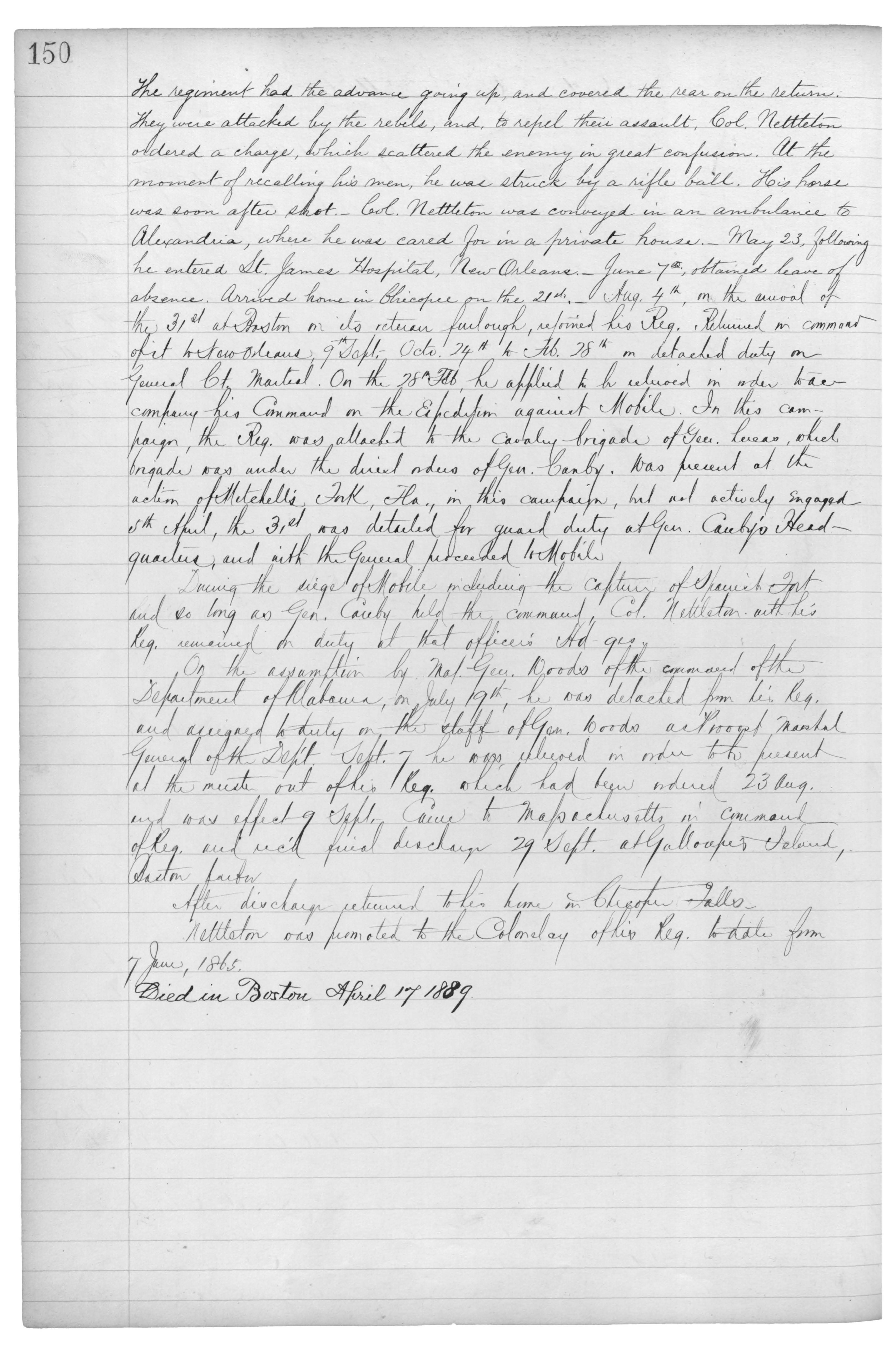 On the 1st of May, 1864, about 10 miles from Alexandria, La., he was wounded. The forces had crossed the Red River on a scouting expedition, and had gone up on the opposite bank several miles. The regiment had the advance going up, and covered the rear on the return. They were attacked the rebels, and to repel their assault, Col. Nettleton ordered a charge, which scattered the enemy in great confusion. At the moment of recalling his men, he was struck by a rifle ball. His horse was soon after shot. Col. Nettleton was conveyed in an ambulance to Alexandria, where was cared for in a private house. May 23, following he St. James Hospital, New Orleans. June 7th obtained leave of absence. Arrived home in Chicopee on the 21st. August 4th on the arrival of the 31st at Austin in its return furlough, rejoined his Reg. Returned in command of it to New Orleans, 9th Sept. Octo 24th to Feb 28th on detached duty on General Ct. martial. On the 28th he applied to be {unreadable} company his Command on the Expedition against Mobile. In this campaign the Reg. was attached to the cavalry brigade of Gen. Lucas, which brigade was under the direct orders of Gen. Canby. Was present at the action of Mitchell's Fork, Fla., in this campaign, but not actively engaged . 5th April, the 31st was detailed for guard duty at Gen. Canby's Headquarters, and with the General proceeded to Mobile.