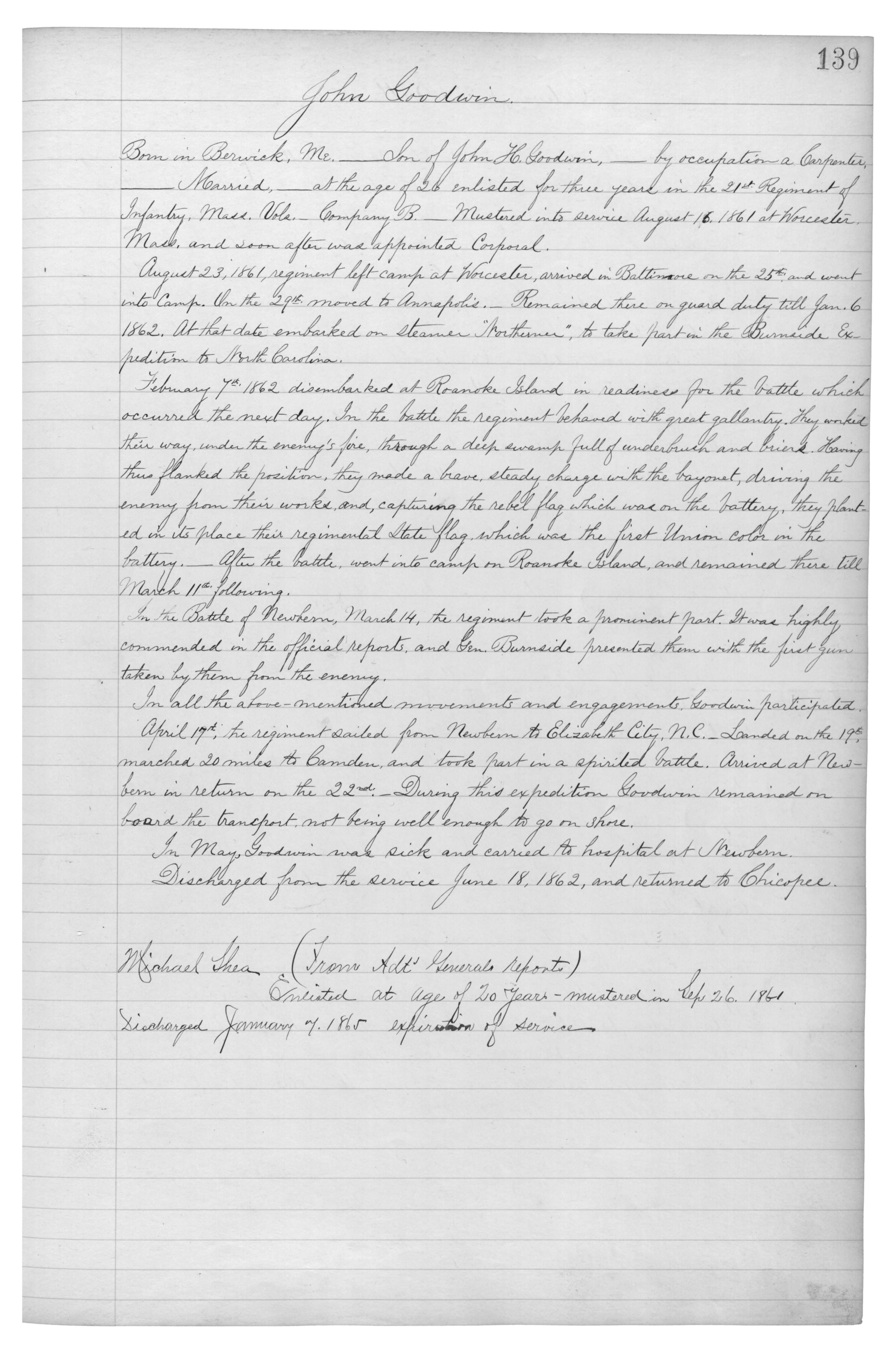 Born in Berwick, Me.___Son of John H. Goodwin,___by occupation a Carpenter,___Married,___at the age of 26 enlisted for three years in the 21st Regiment of Infantry, Mass. Vols.__Company B,___Mustered into service August 16, 1861 at Worcester, Mass. and soon after was appointed Corporal.