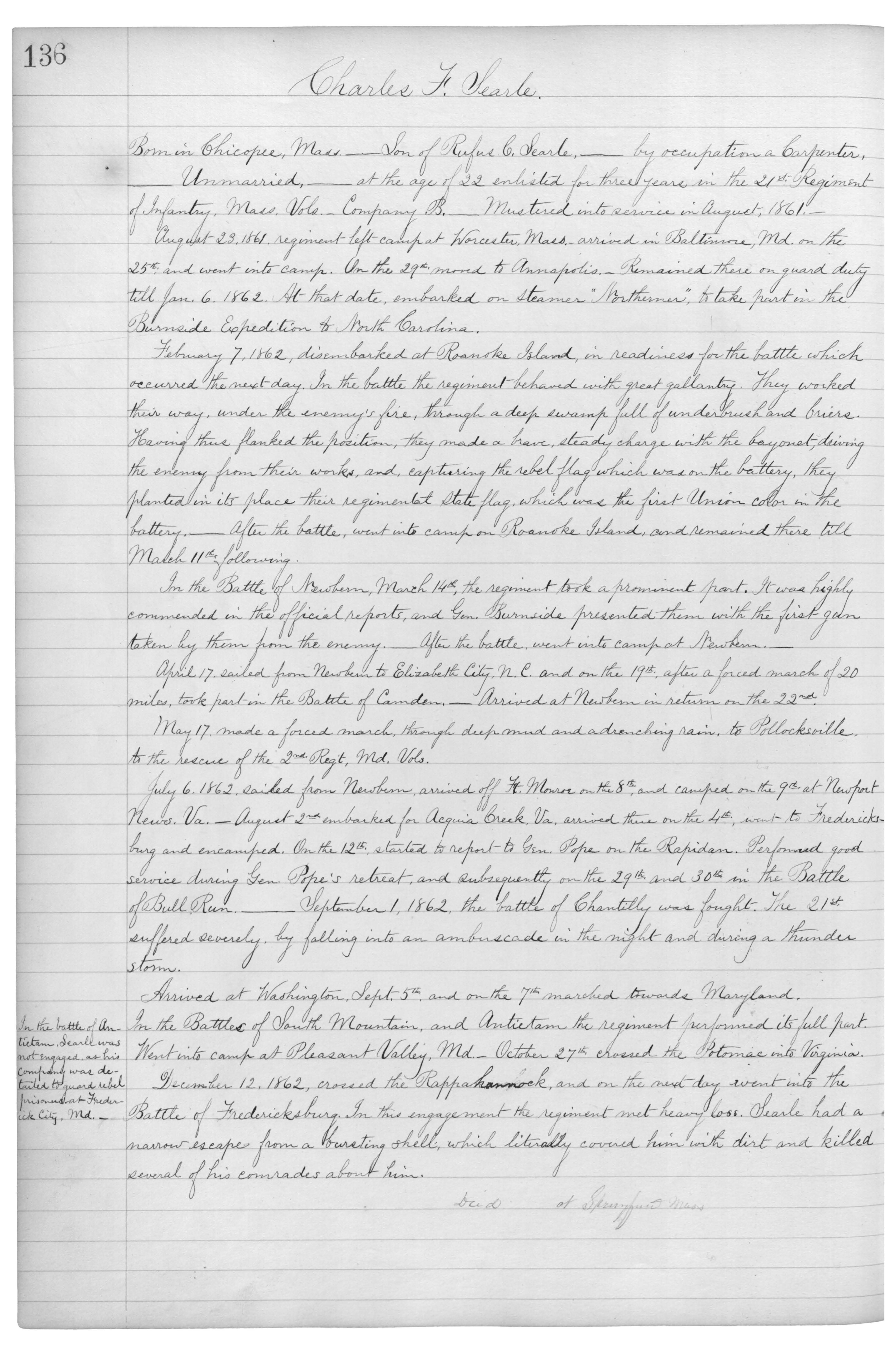 Born in Chicopee, Mass___Son of Rufus C. Searle,___by occupation a Carpenter,___Unmarried,___at the age of 22 enlisted for three years in the 21st Regiment of infantry, Mass. Vols.__Company B.___Mustered into service in August, 1861.__