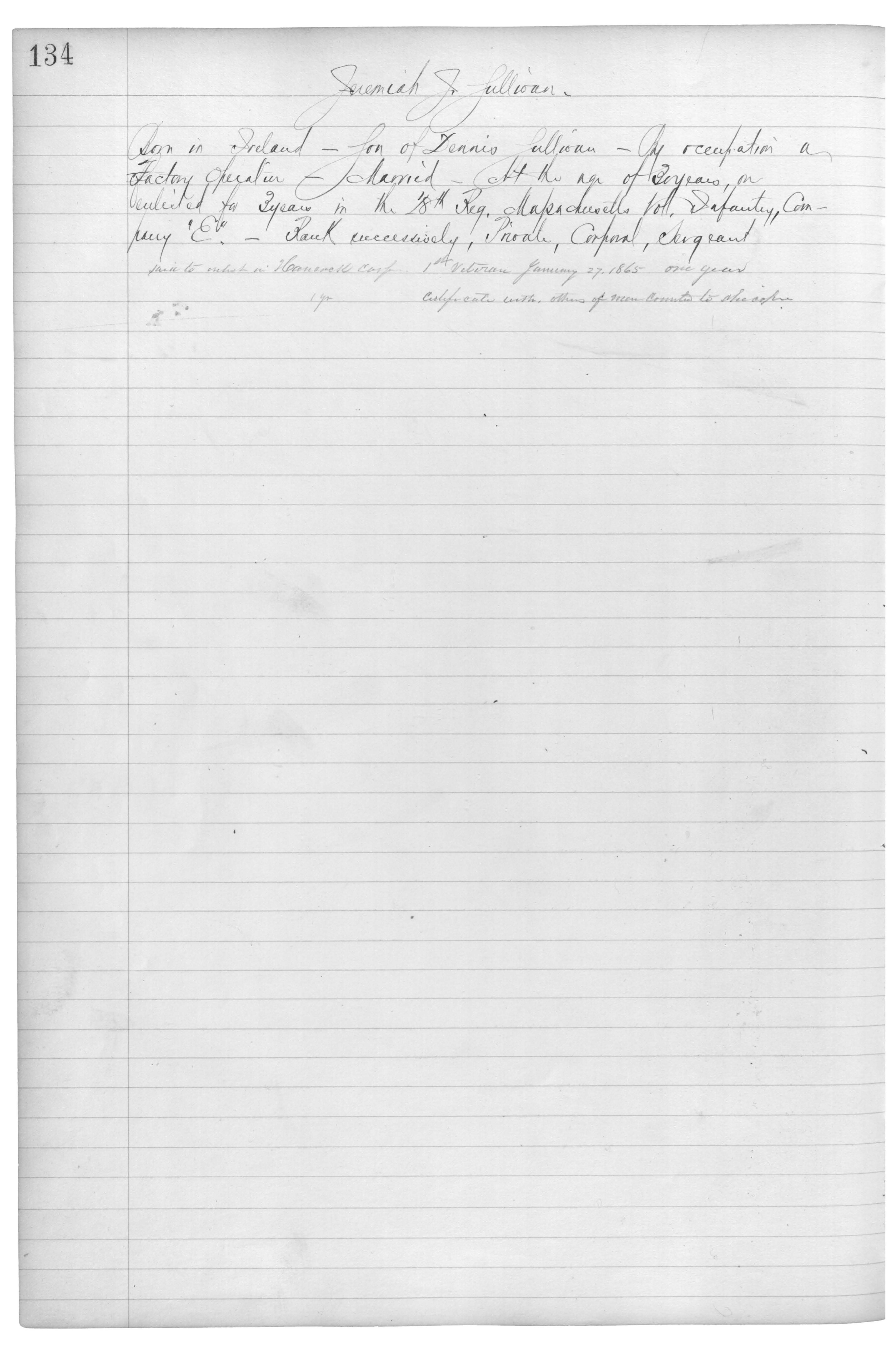 Born in Scotland___Son of Dennis Sullivan___By occupation a Factory Operator___Married___At the age of 30 years, enlisted for 3 years in the 28th Reg. Massachusetts Vol. Infantry, Company "E".___Rank successively, Private, Corporal, Sergeant