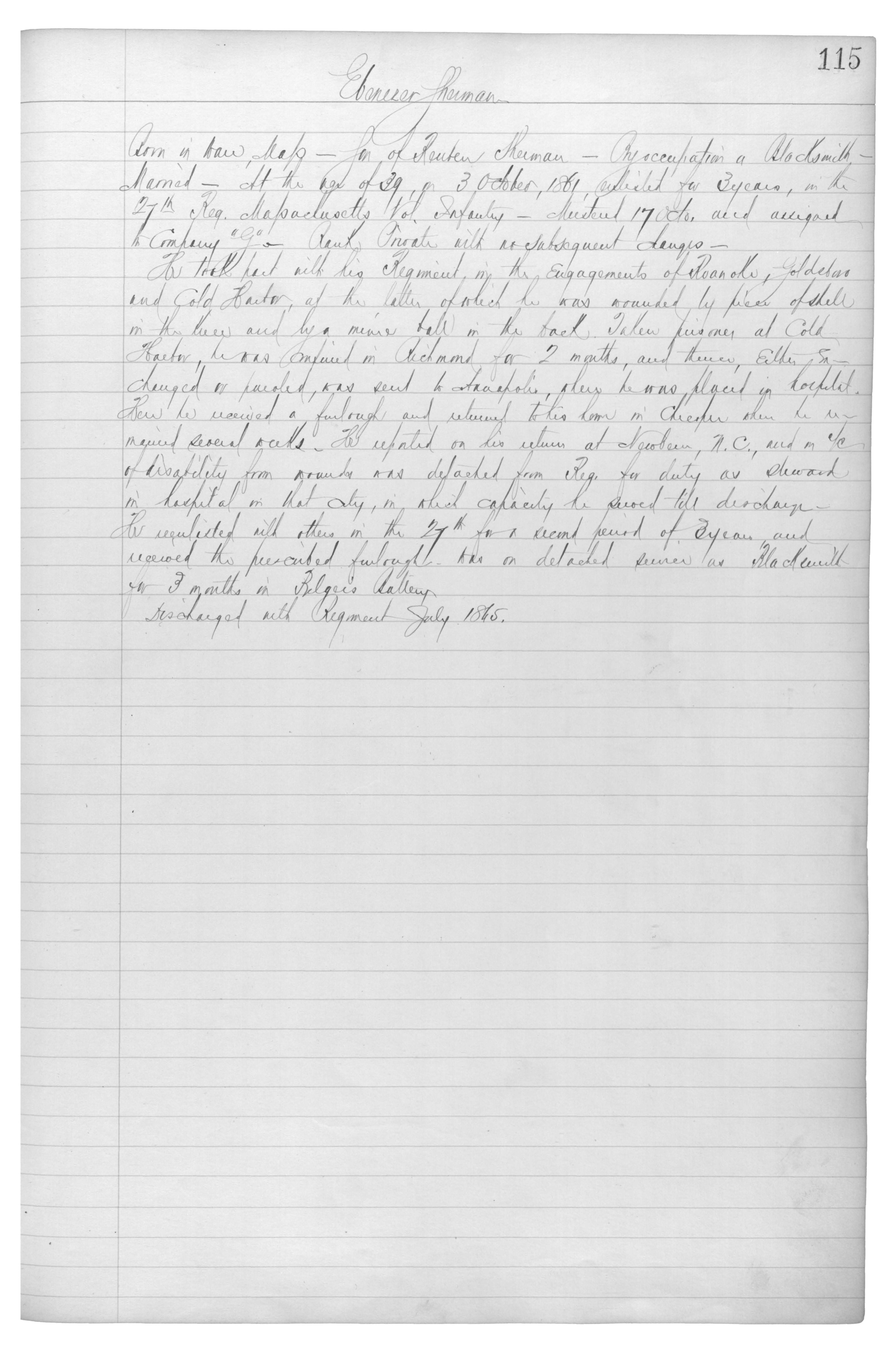 Born in ?Ware?, Mass___Son of Reuben Sherman___By occupation a Blacksmith___Married___At the age of 39, on 3 October, 1861, enlisted for 3 years, in the 27th Reg. Massachusetts Vol. Infantry___Mustered 17 Octo. and assigned to Company "G"___Rank Private with no subsequent changes__