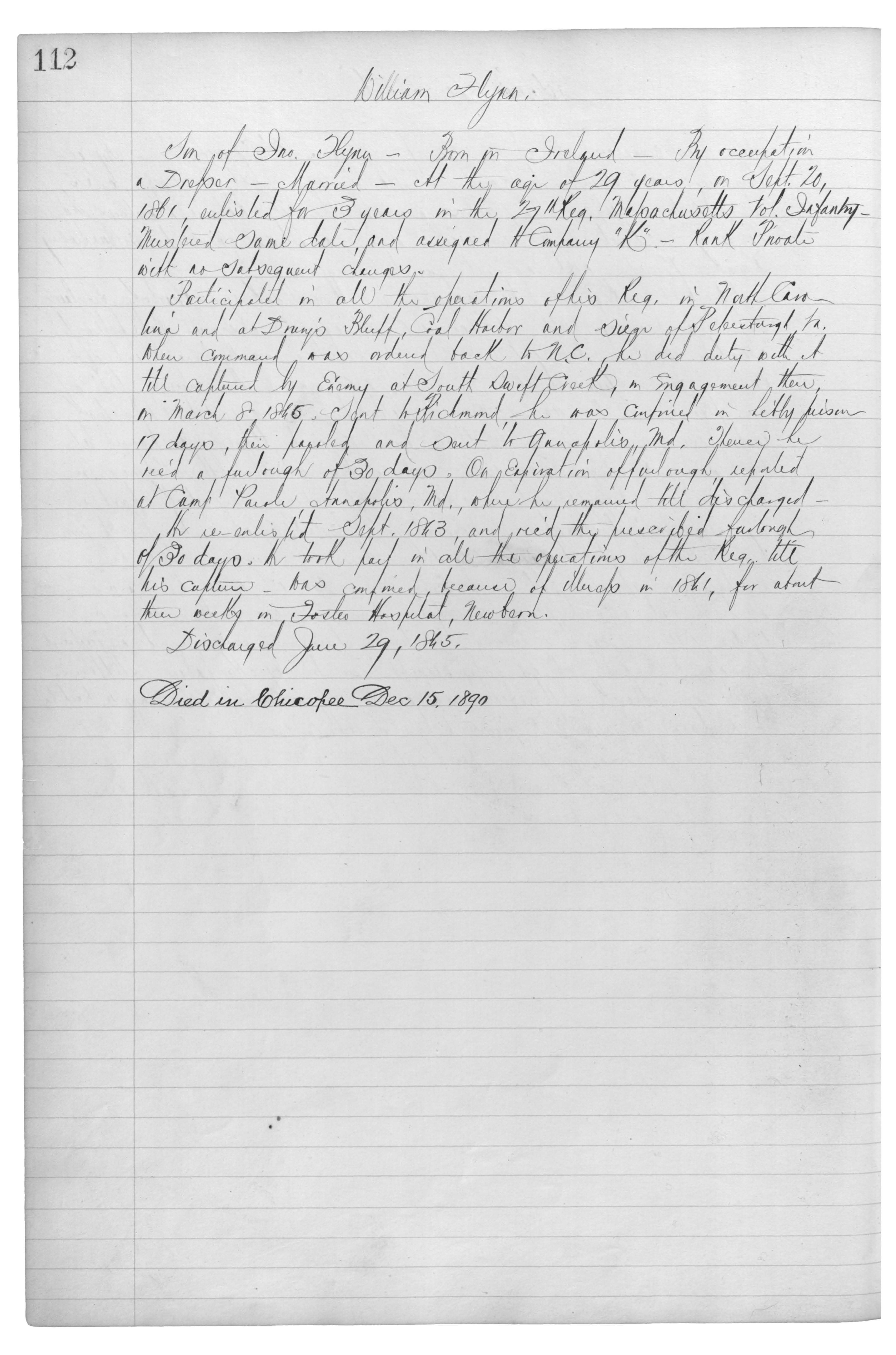 Son of Ira Flynn___Born in Ireland___By occupation a dresser___Married___At the age of 29 years, on Sept. 20, 1861, enlisted for 3 years in the 27th Reg. Massachusetts Vol. Infantry. Mustered same date, and assigned to Comapny "K".__Rank Private with no subsequent changes.