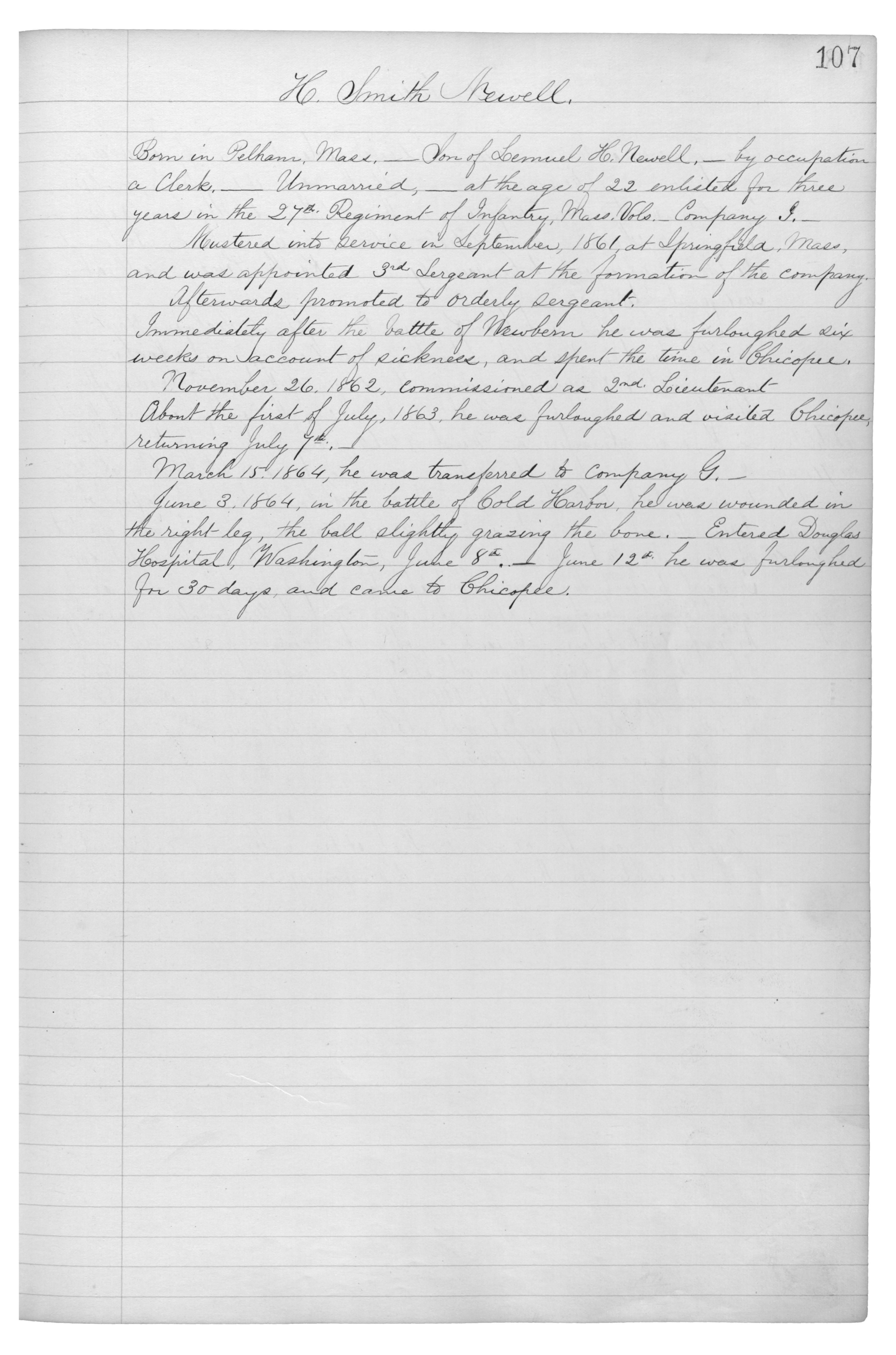 Born in Pelham, Mass.___ Son of Lemuel H. Newell,___ by occupation a Clerk.___ Unmarried, __ at the age of 22 enlisted for three years in the 27th Regiment of Infantry, Mass, Vols. Company G. ___