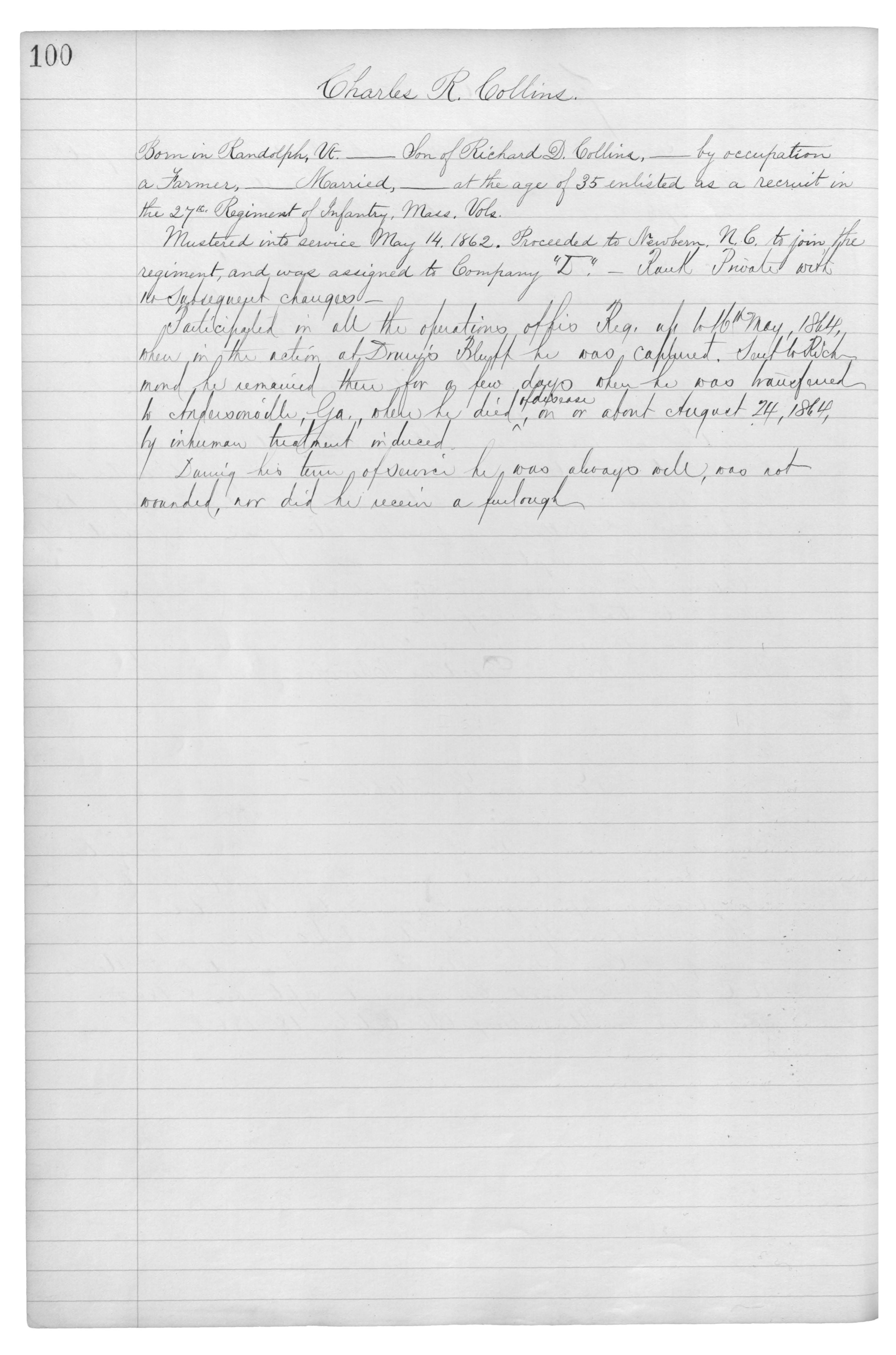 Born in Randolph, Vt.___ Son of Richard D. Collin,___ by occupation a Farmer,___ Married,___ at the age of 35 enlisted as a recruit in the 27th Regiment of Infantry, Mass. Vols.