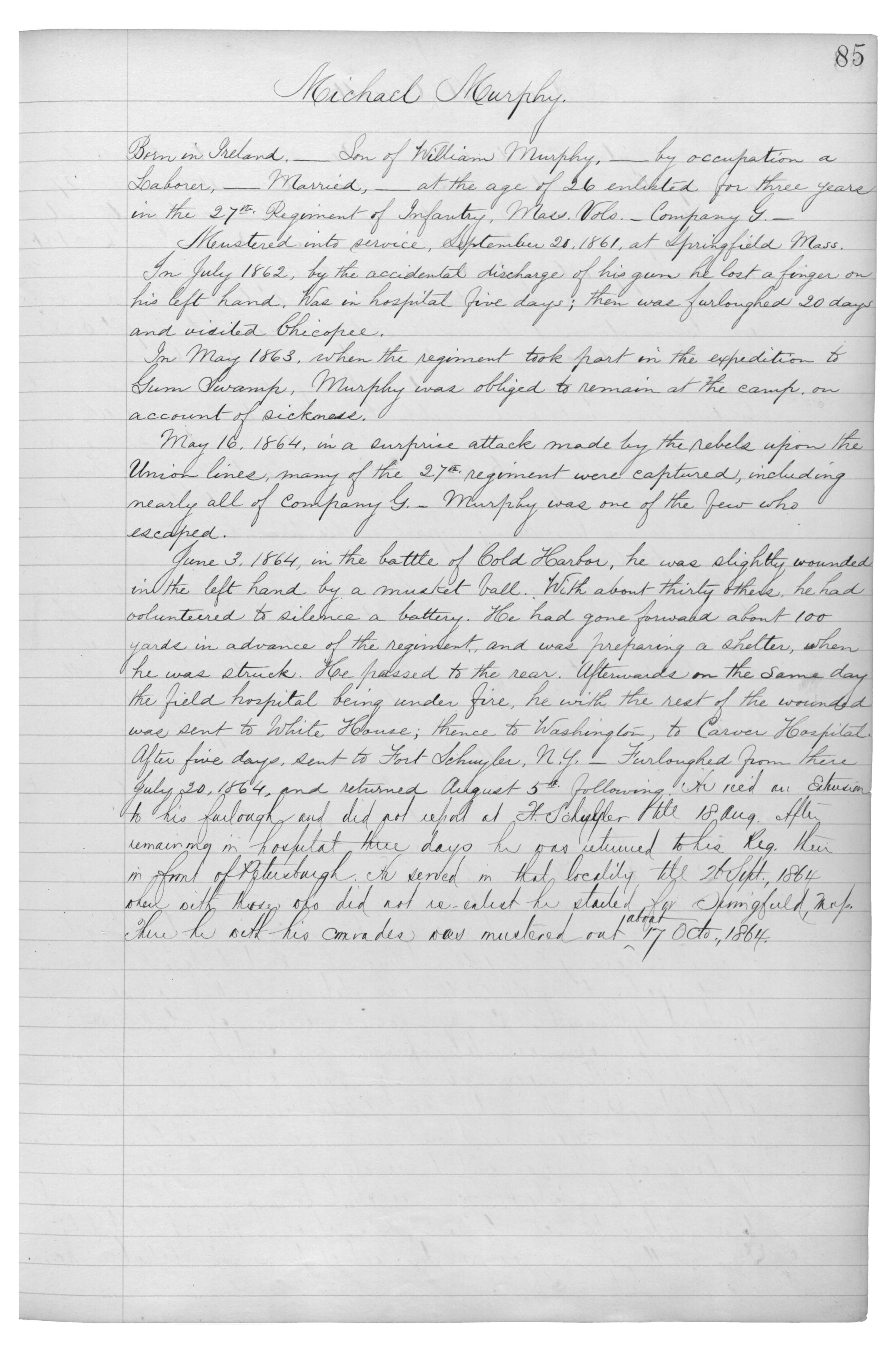 Born in Ireland.___Son of William Murphy,___by occupation a Laborer,___Married,___at the age of 26 enlisted for three years in the 27th. Regiment of Infantry, Mass. Vols.__Company G.__