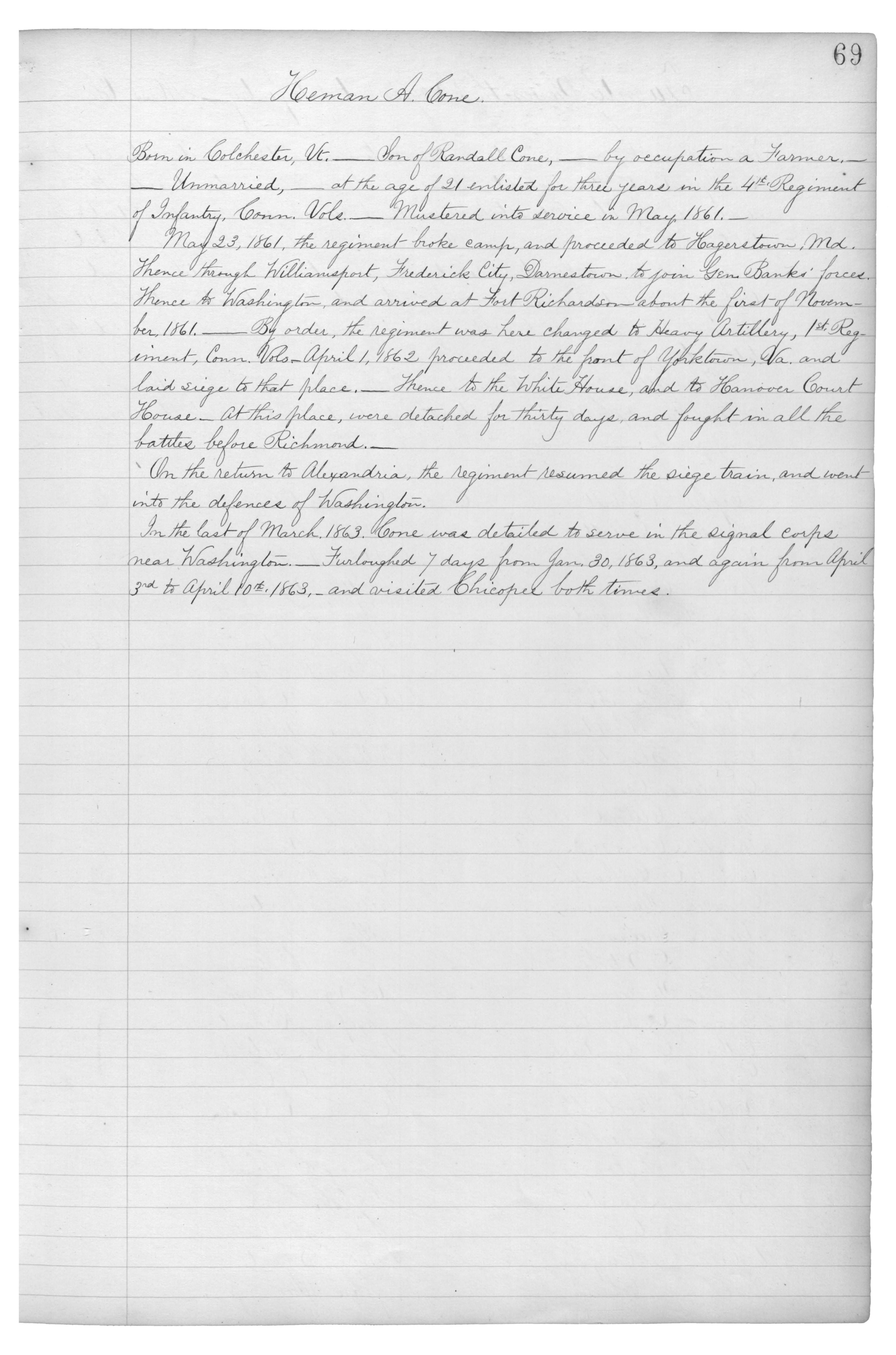 Born in Colchester, Vt.___Son of Randall Cone,___by occupation a Farmer,___Unmarried,___at the age of 21 enlisted for three years in the 4th. Regiment of Infantry, Conn. Vols.___Mustered into service in May, 1861.__