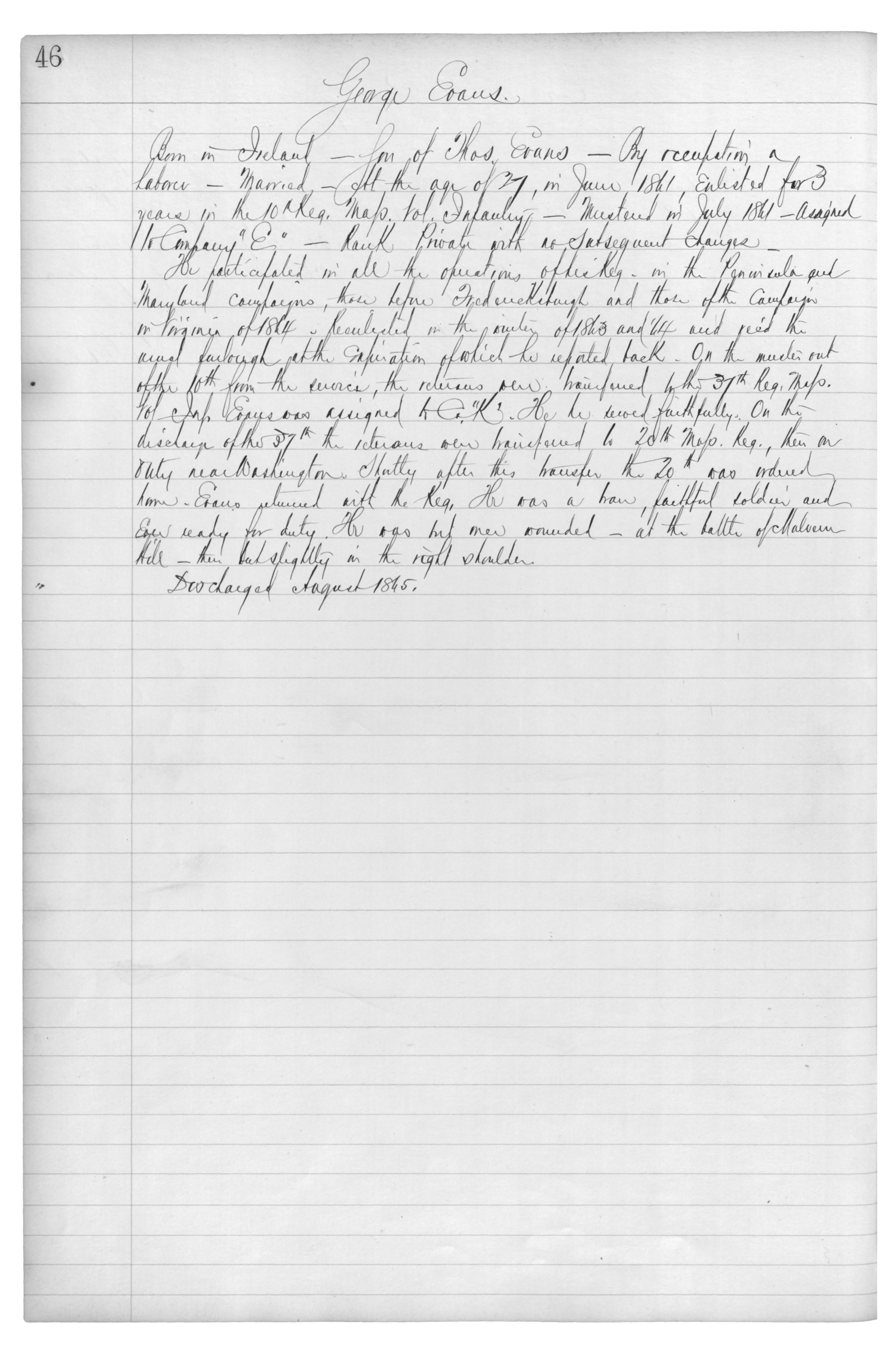 Born in Ireland___Son of Thos Evans___By occupation a Laborer___Married___At the age of 27, in June, 1861, enlisted for 3 years in the 10th Reg. Mass. Vol. Infantry___Mustered in July 1861___Assigned to Company "E"___Rank Private with no subsequent changes__