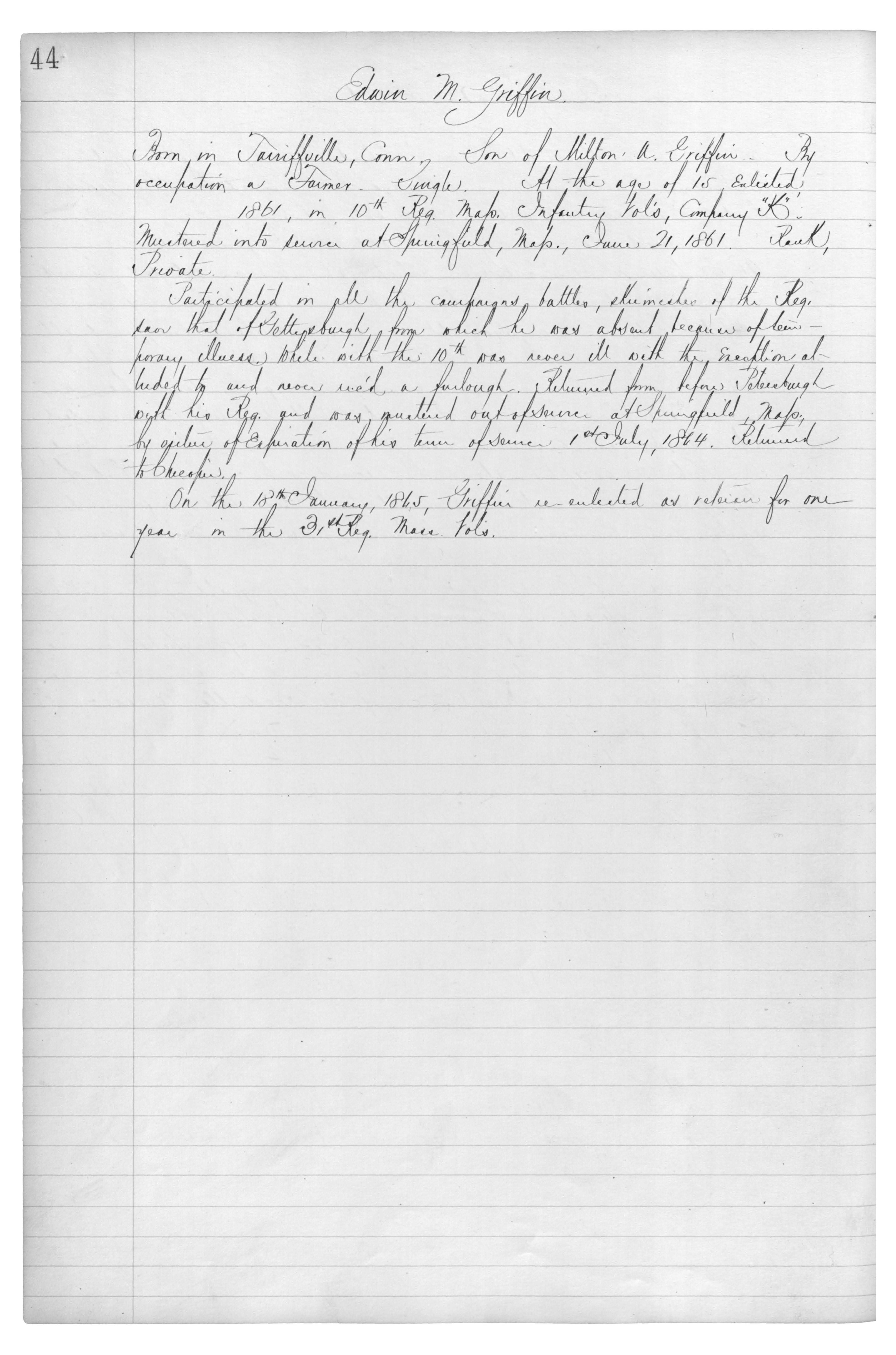 Born in Tarriffville, Conn. Son of Milton A. Griffin. By occupation a Farmer. Single. At the age of 15, Enlisted 1861, in 10th Reg. Mass. Infantry Vol's, Company "K". Mustered into service at Springfield, Mass., June 21, 1861. Rank, Private.