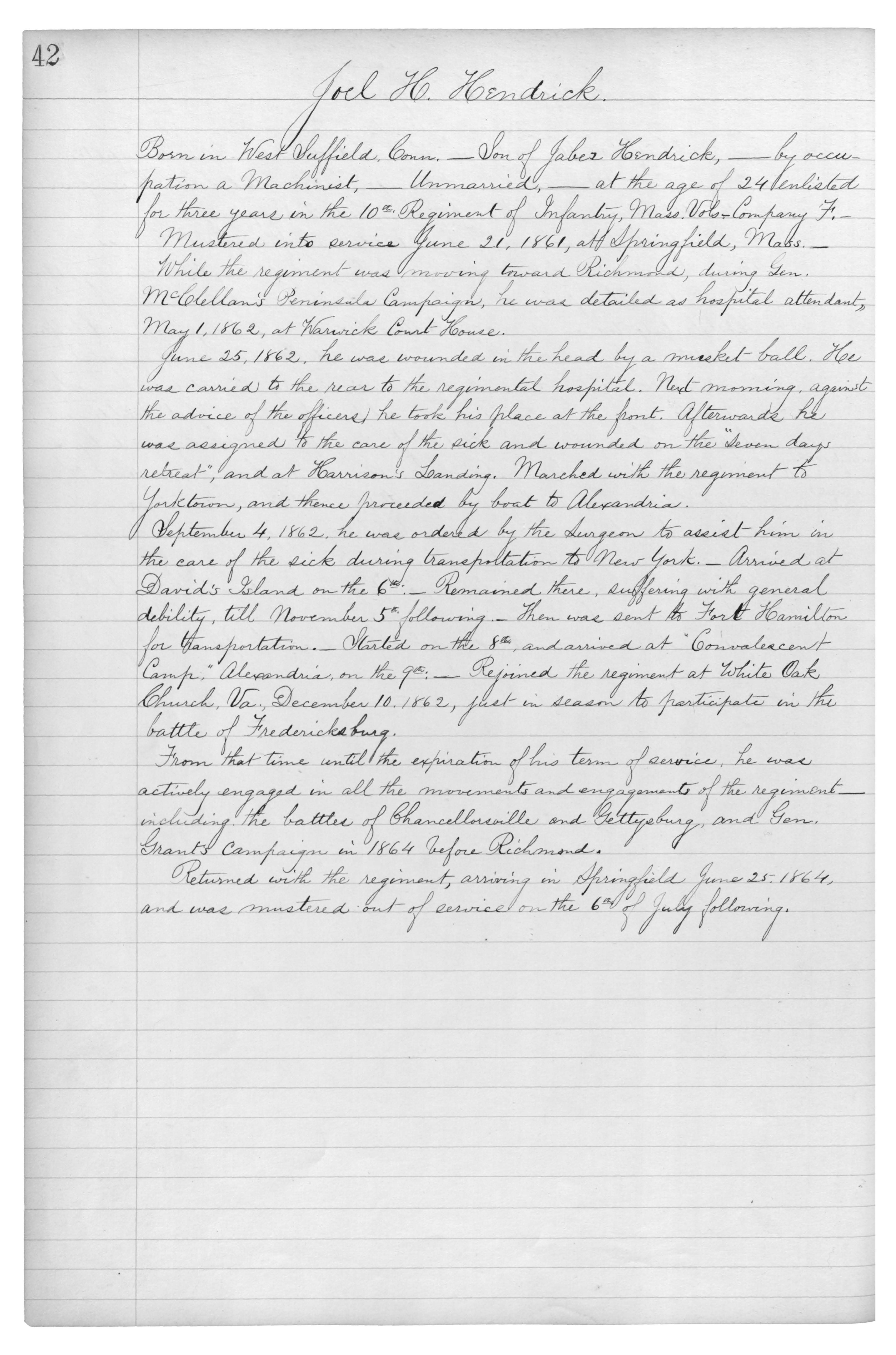 Born in West Suffield, Conn.___Son of Jabez Hendrick,___by occupation a Machinist,___Unmarried,___at the age of 24 enlisted for three years in the 10th. Regiment of Infantry, Mass Vols.__Comapny F.__