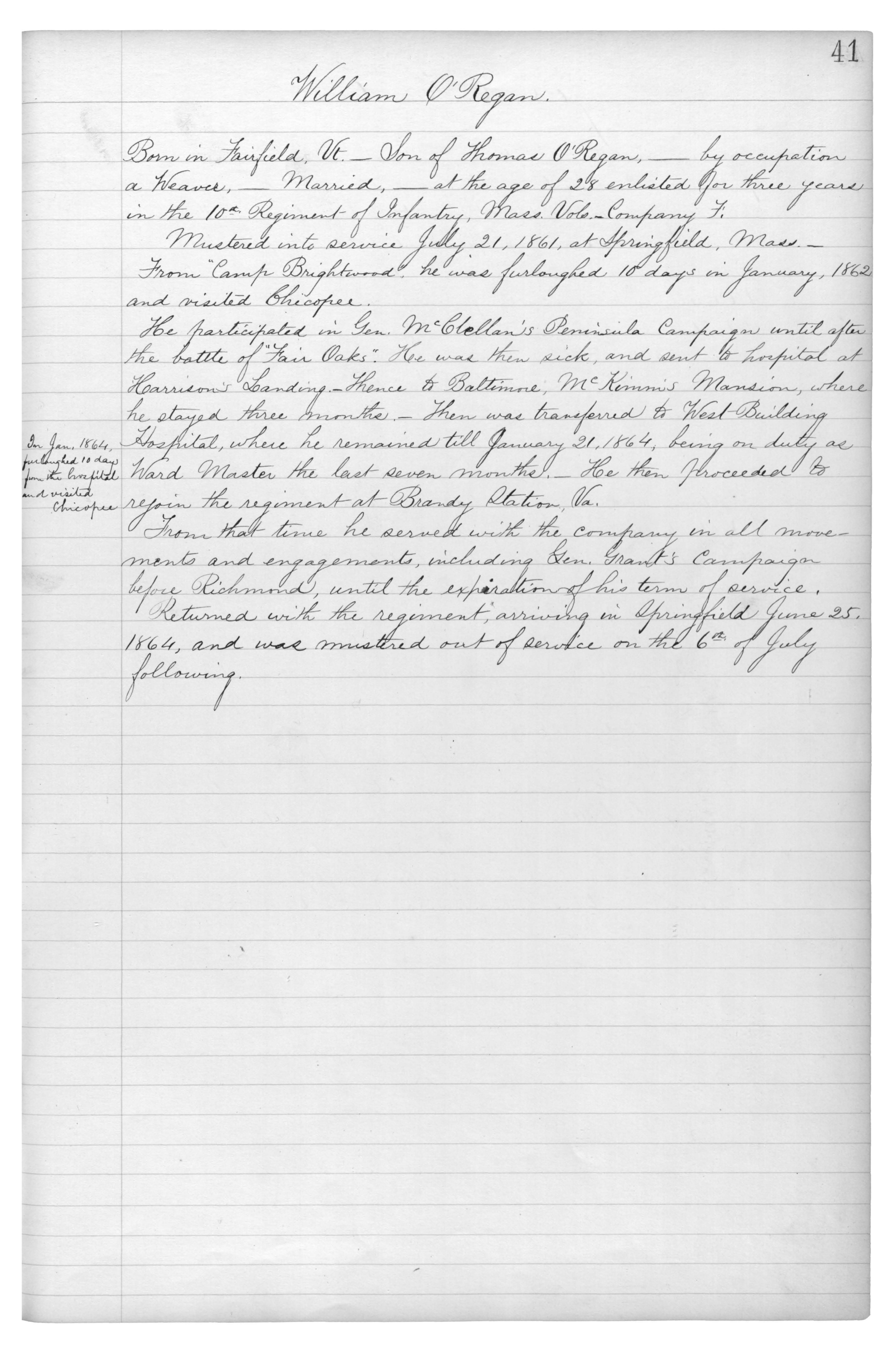 Born in Fairfield, Vt.___Son of Thomas O'Regan,___by occupation a Weaver,___Married,___at the age of 28 enlisted for three years in the 10th. Regiment of Infantry, Mass. Vols.__Comapny F.