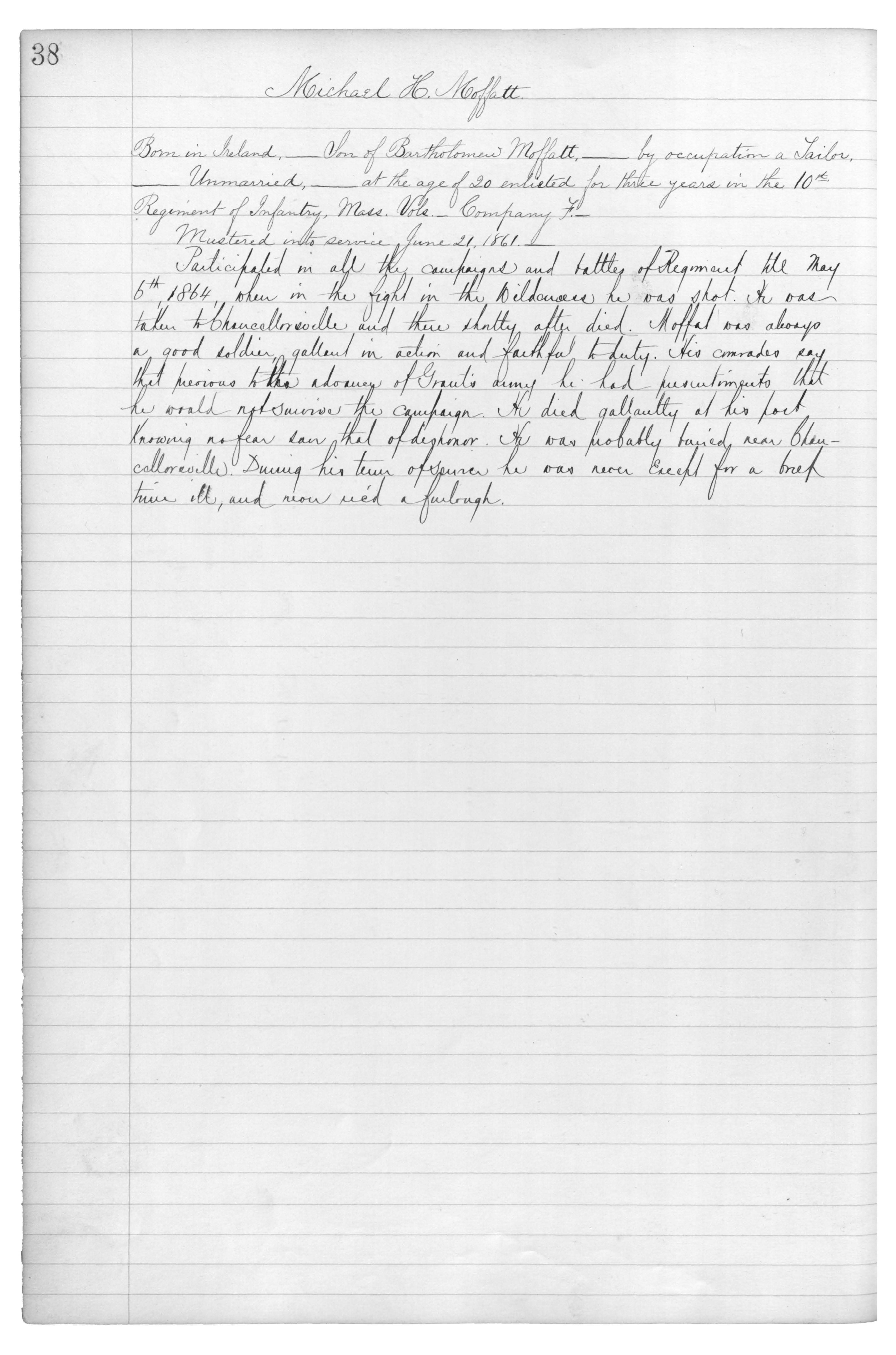 Participated in all the campaigns and battles of Regiment till May 6th., 1864, when in the fight in the Wilderness he was shot. He was taken to Chancellorsville and there shortly after died. Moffatt was always a good soldier, gallant in action and faithful to duty. His comrades say that previous to the advances of Grant's army he had presentiments that he would not survive the campaign. He died gallantly at his post knowing no fear (unreadable} that of dishonor. He was probably buried near Chancellorsville. During his term of service he was never except for a brief time ill, and never rec'd a furlough.