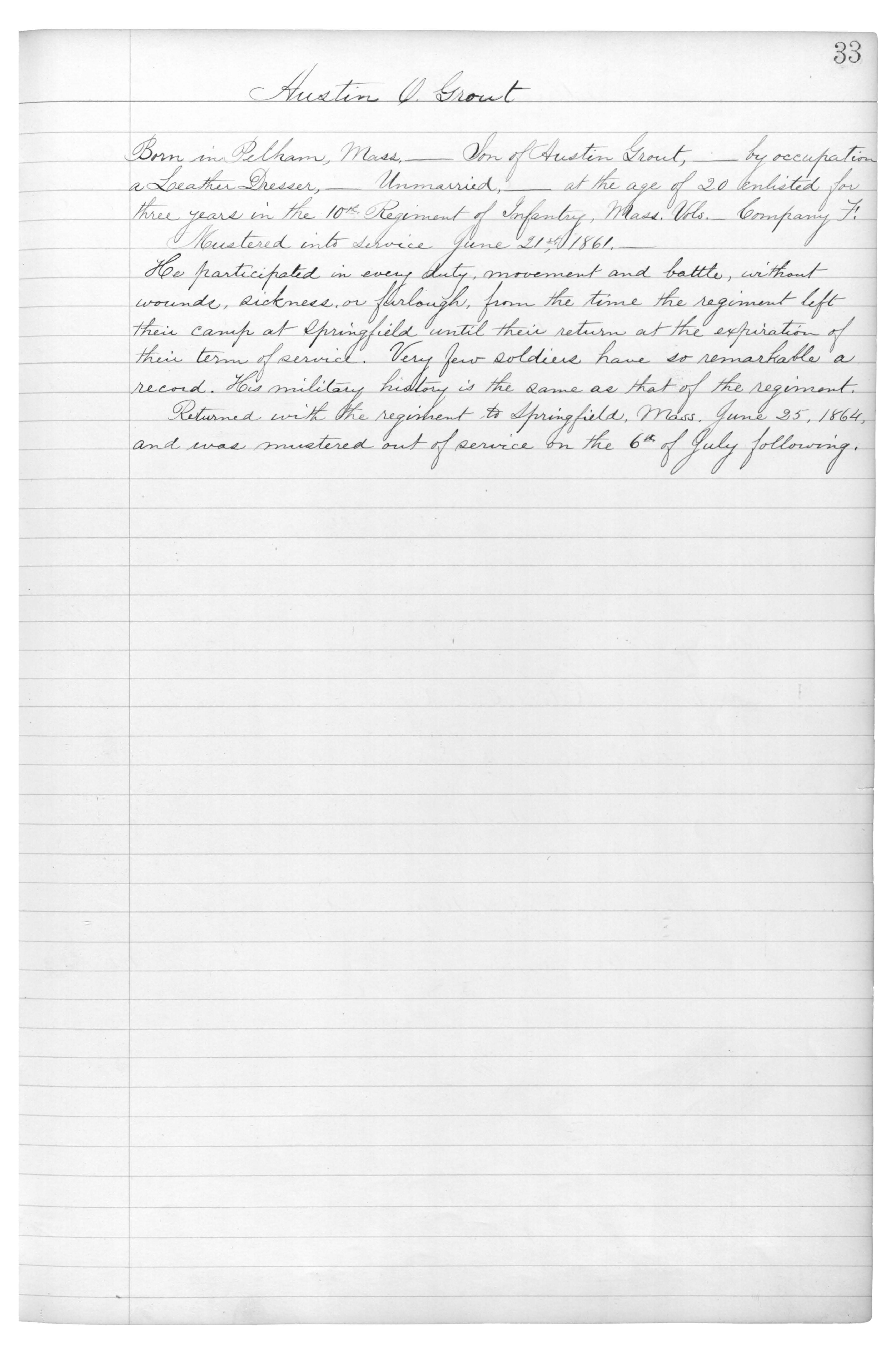 Born in Pelham, Mass.___Son of Austin Grout,___by occupation a Leather Dresser,___Unmarried,___at the age of 20 enlisted for three years in the 10th. Regiment of Infantry, Mass. Vols.___Company F.