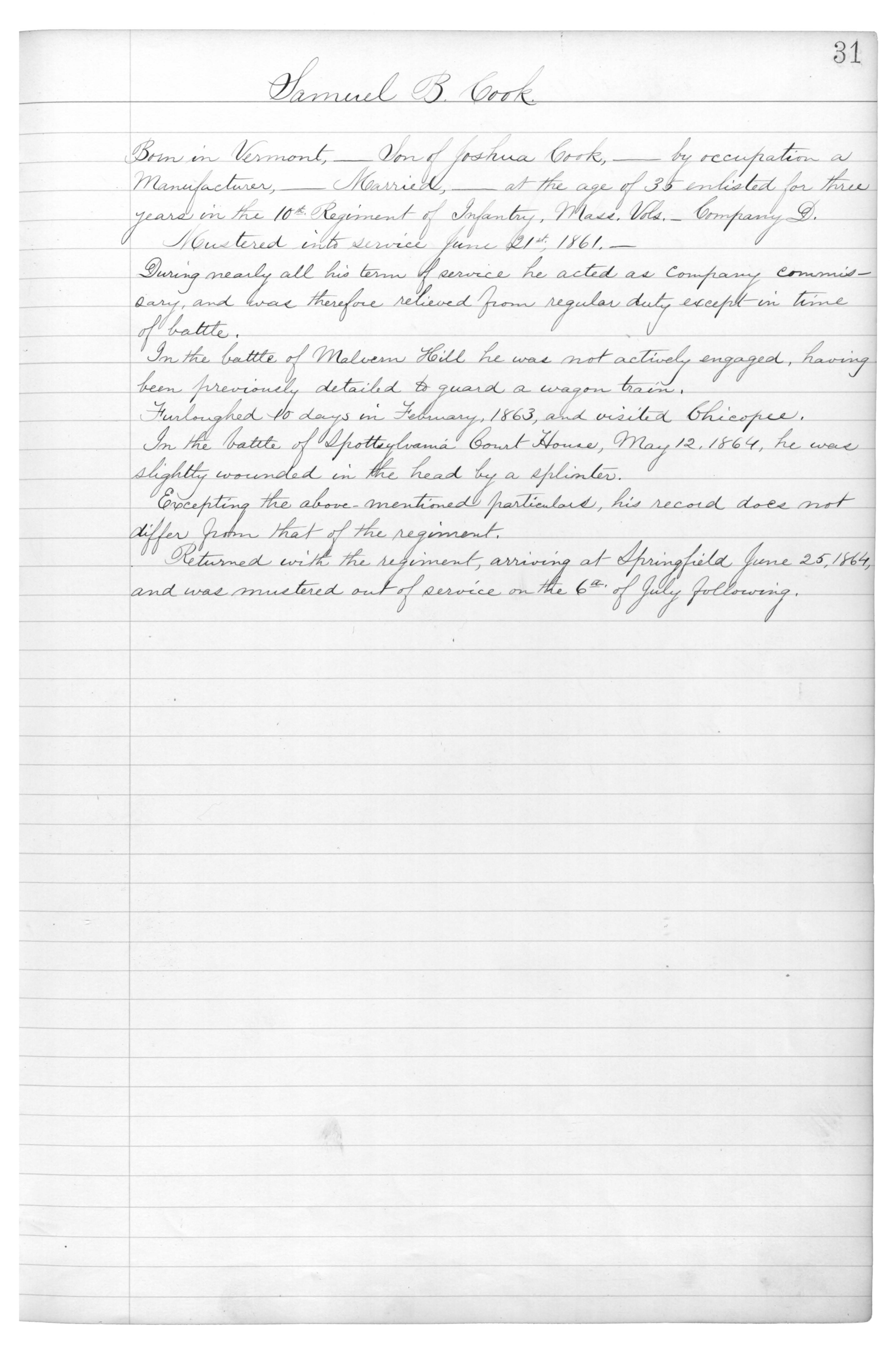 Born in Vermont,___Son of Joshua Cook,___by occupation a Manufacturer,___Married,___at the age of 35 enlisted for three years in the 10th. Regiment of infantry, Mass. Vols.___Company D.